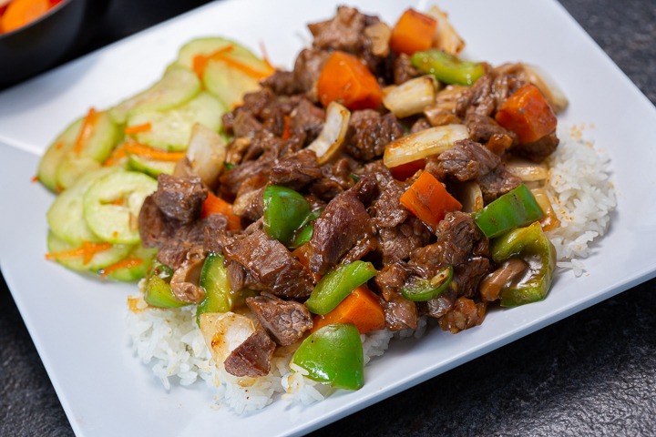 Carne de res preparada a la plancha, con salsa teriyaki, servido con delicioso arroz y acompañado de ensalada de la casa