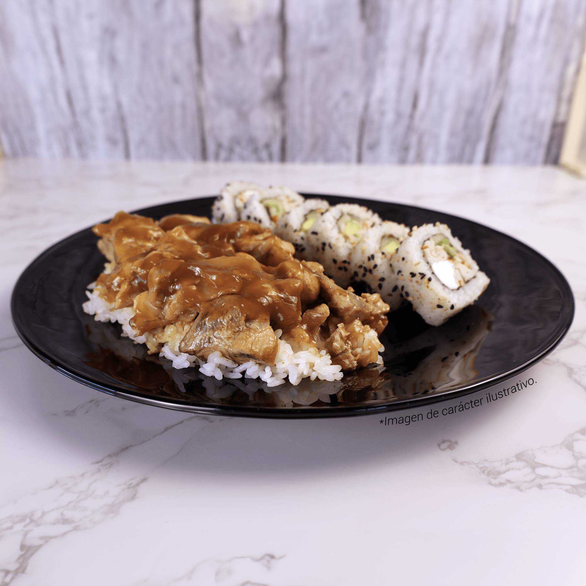 Preparado a la plancha, con salsa teriyaki, servido con delicioso arroz + 1/2 rollo teriyaki