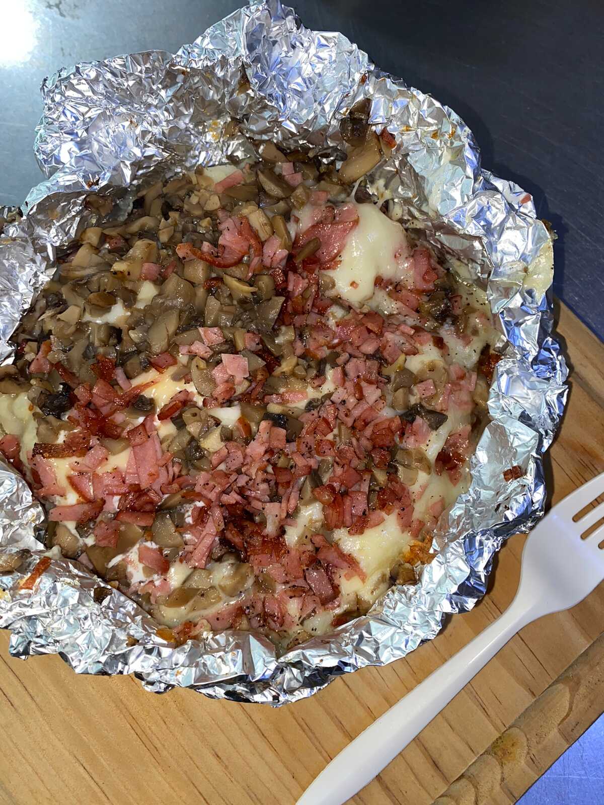 Papa rellena con crema, queso, tocino y champiñón