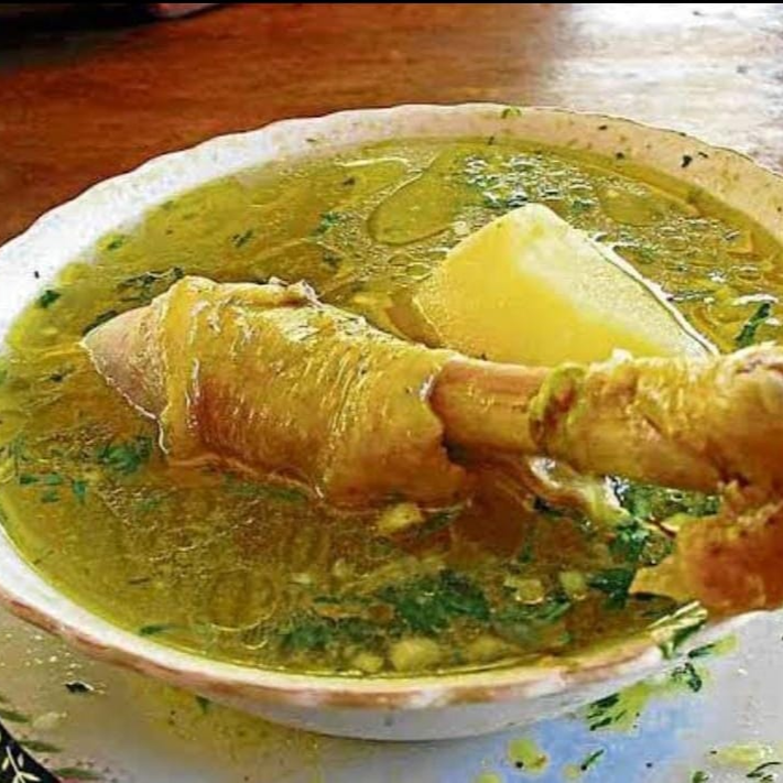 Caldo de gallina con arroz, tortillas, cebolla, cilantro, chile habanero y limones.