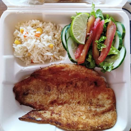 Filete de pescado, con ensalada, arroz, sopa de entrada y tortillas.