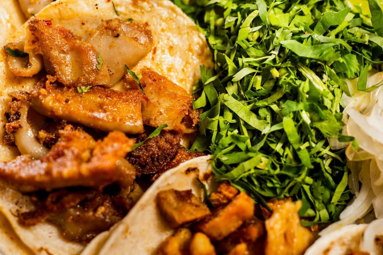 Carne 100% de res incluye cebolla,cilantro sus ricas salsa ,limón y tortillas.