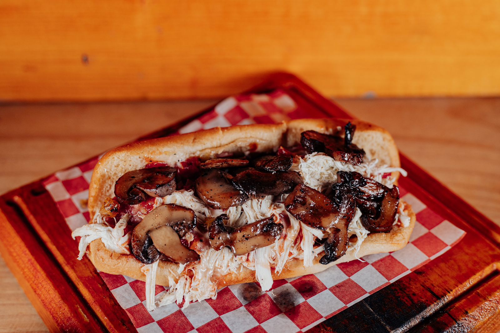 Carne, queso amarillo, queso de hebra, tocino, jamón, mayonesa, cátsup, champiñones, tomate, cebolla y lechuga.