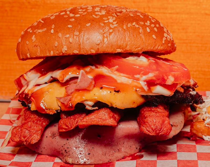 Carne, queso amarillo, queso de hebra, tocino, mayonesa, cátsup, tomate, cebolla y lechuga.