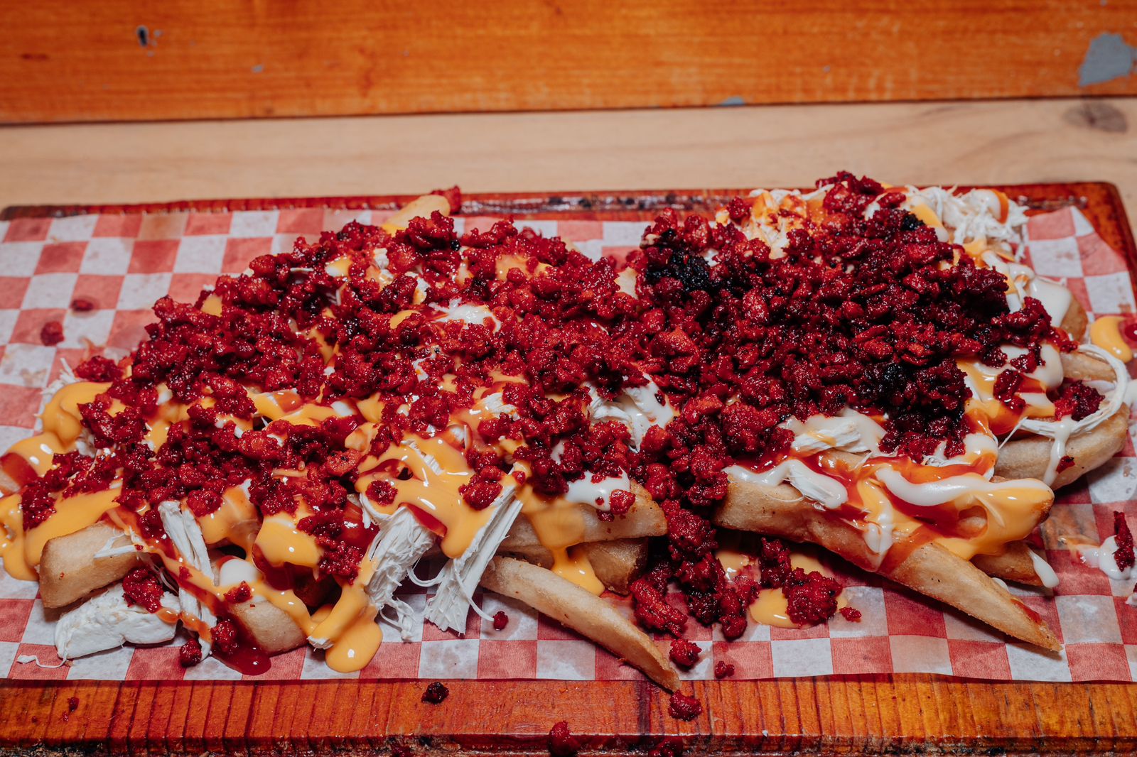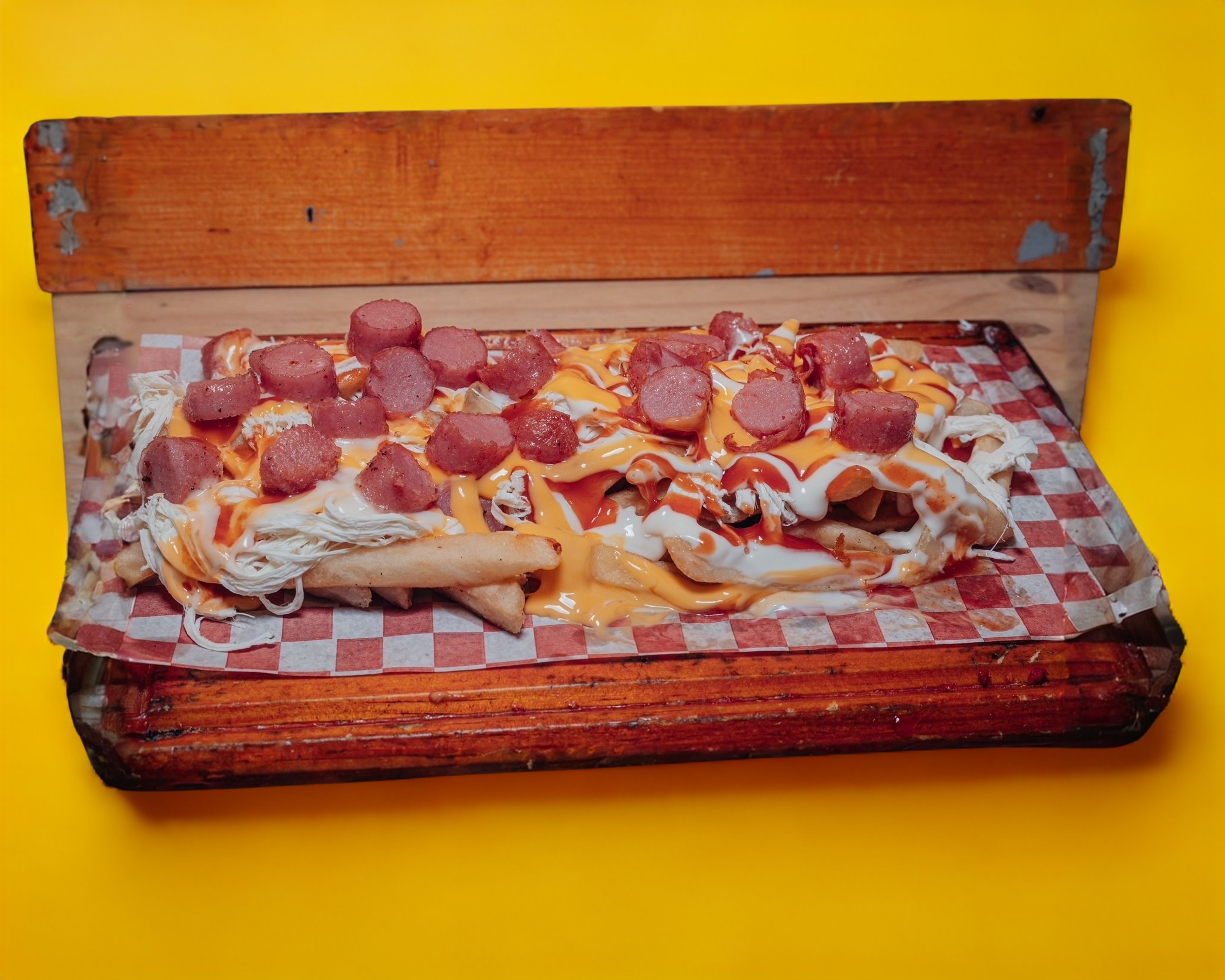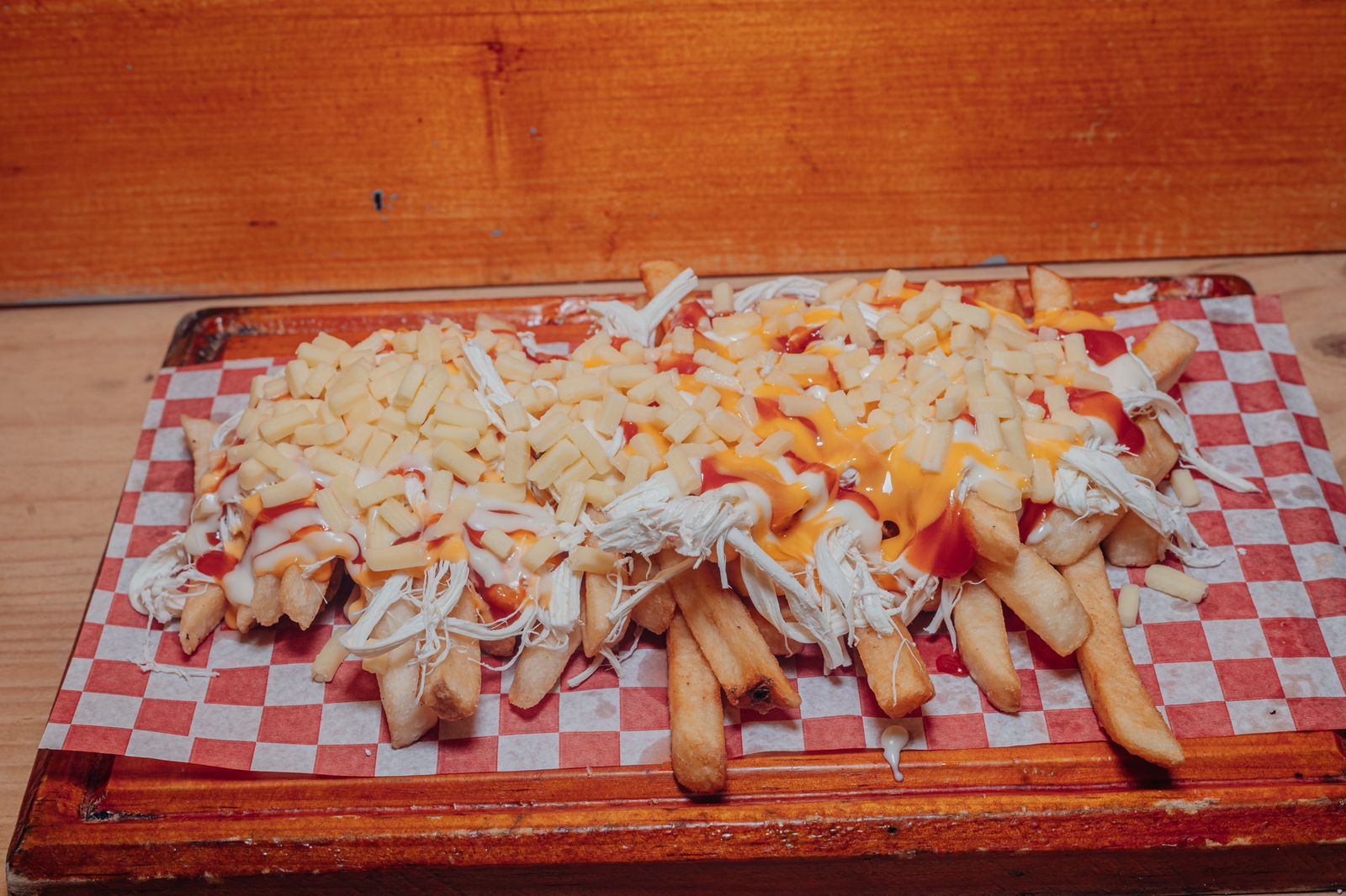 Papas fritas con queso cheddar.