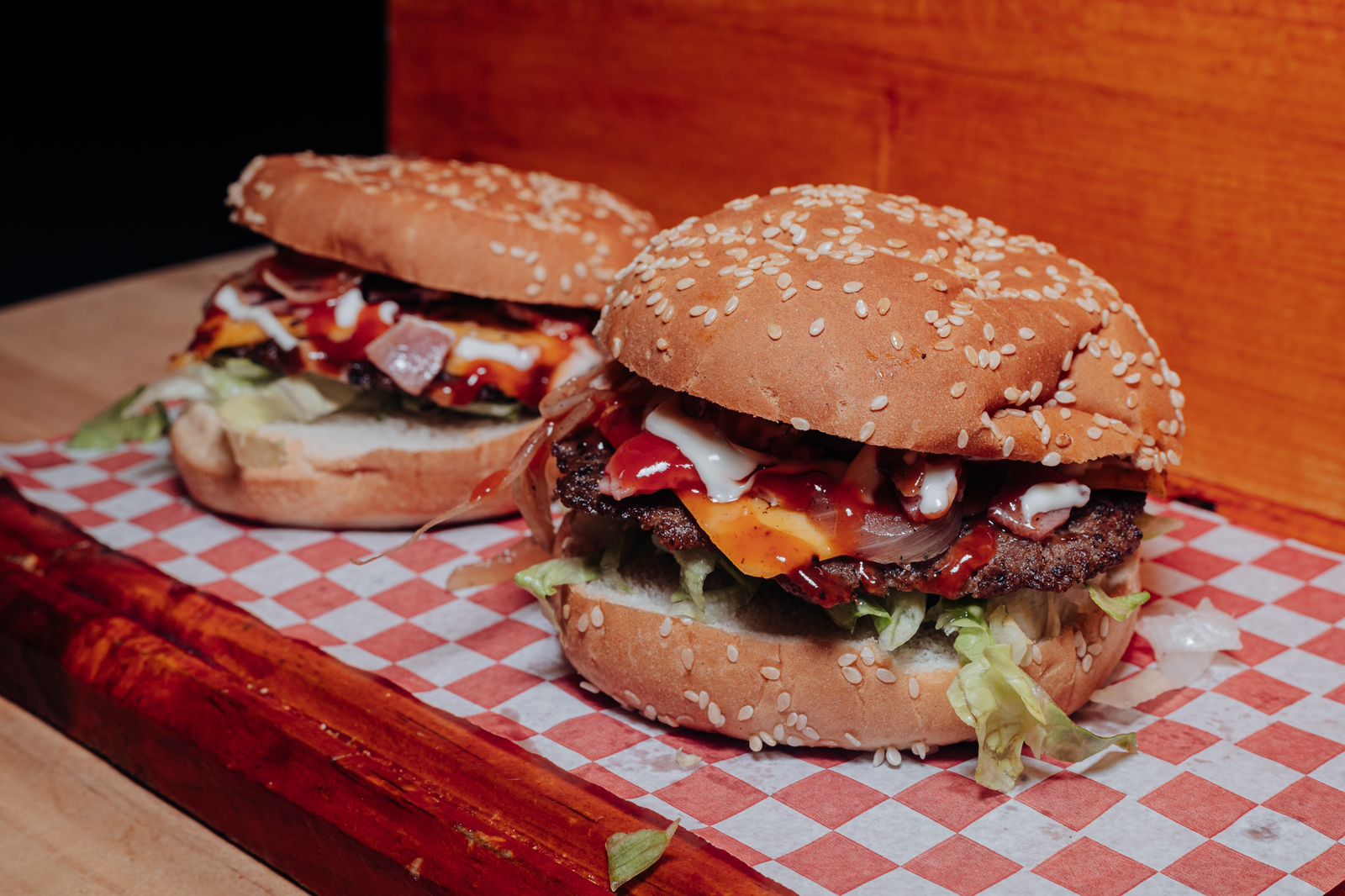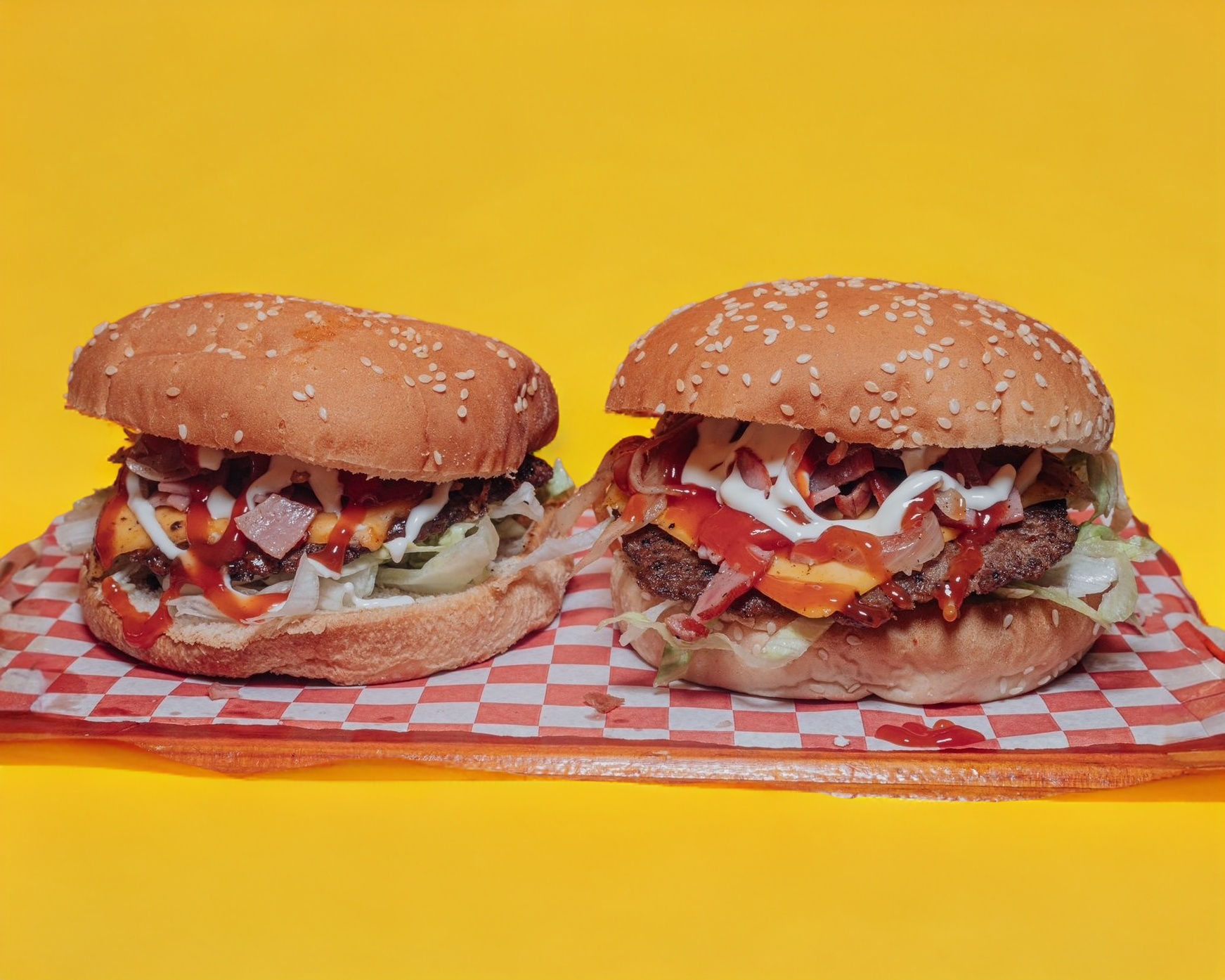 Carne, queso amarillo, queso de hebra, tocino, mayonesa, cátsup, y lechuga.