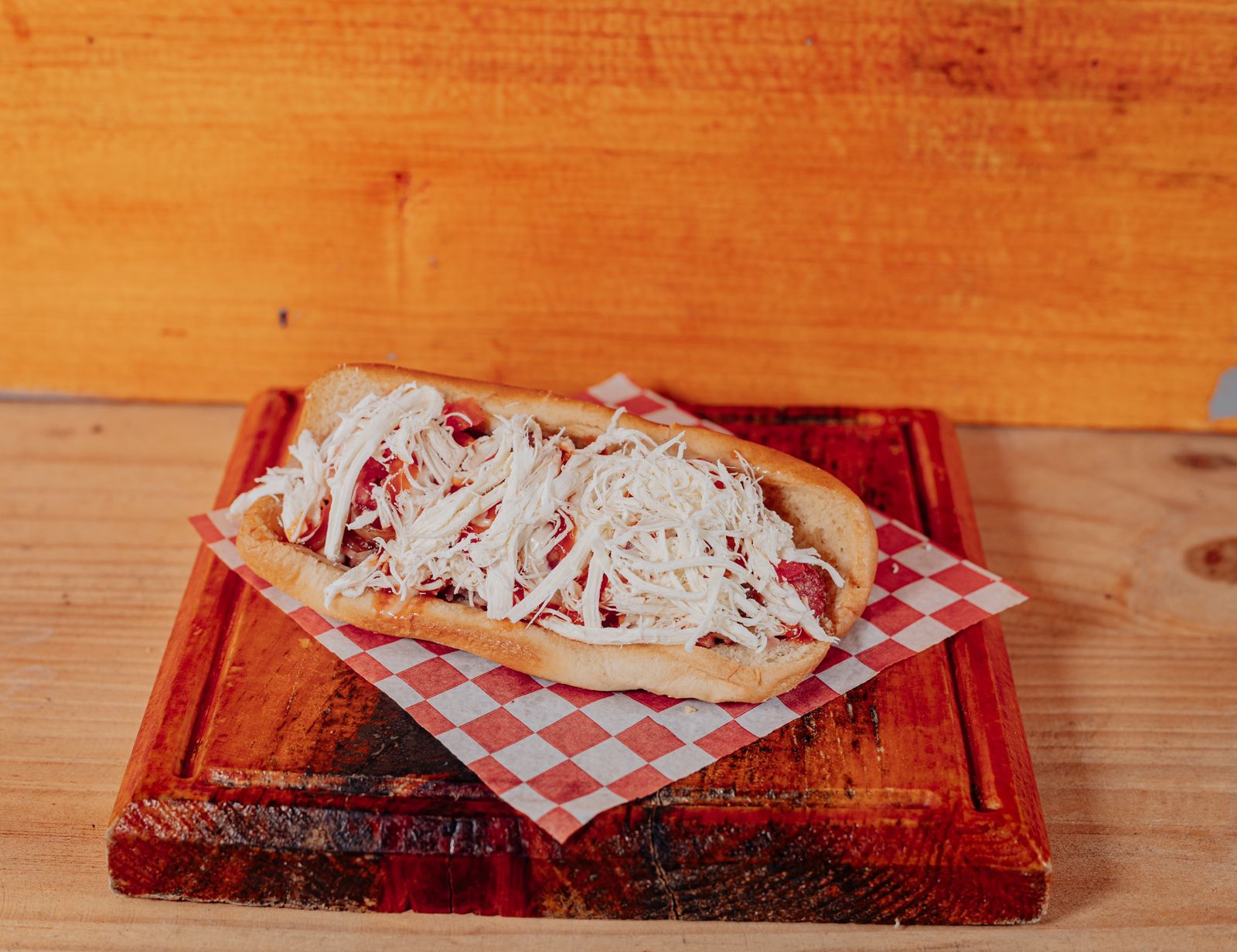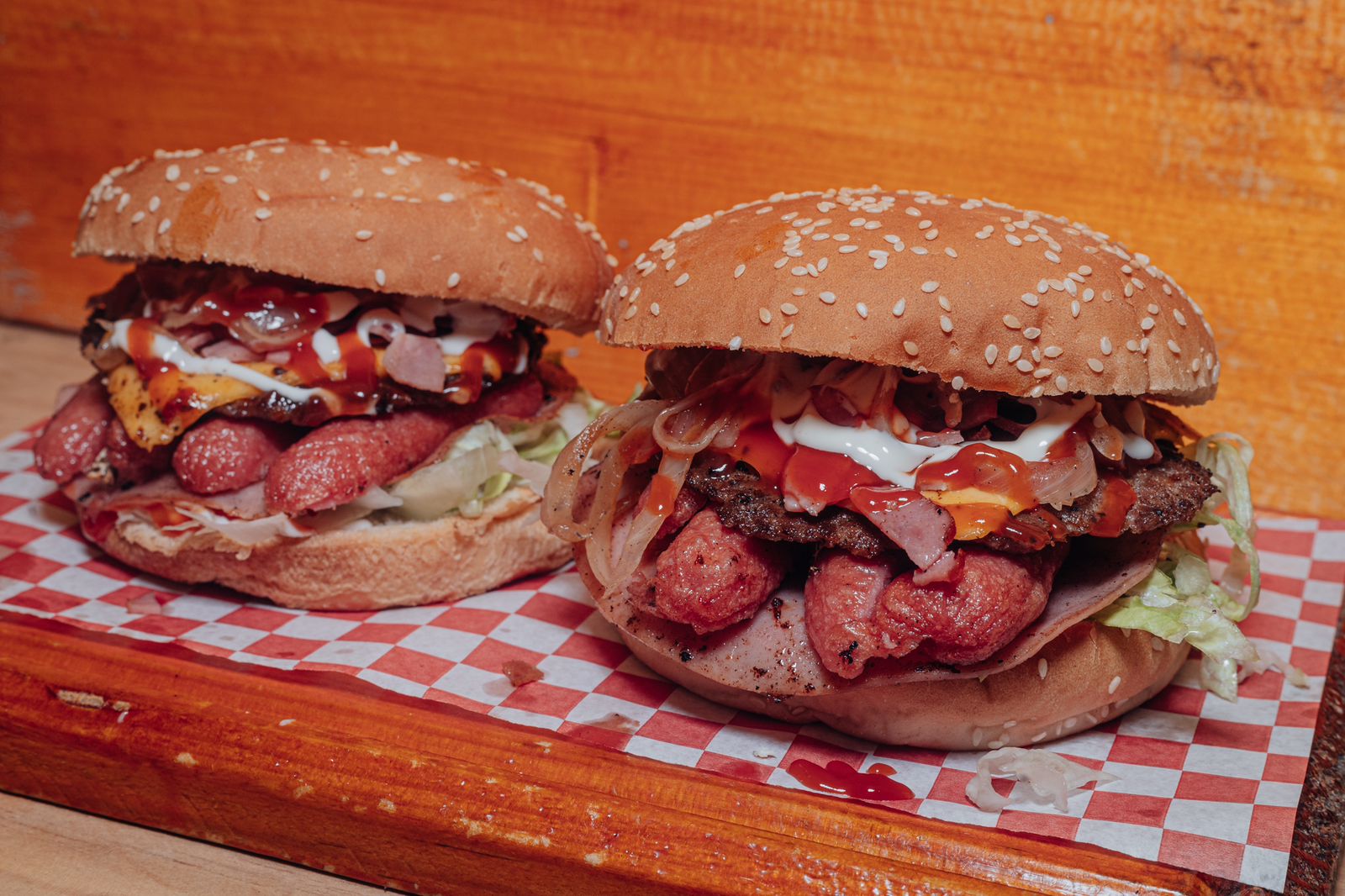 Carne, queso amarillo, queso de hebra, tocino, jamón, salchicha, mayonesa, cátsup, tomate, cebolla y lechuga.