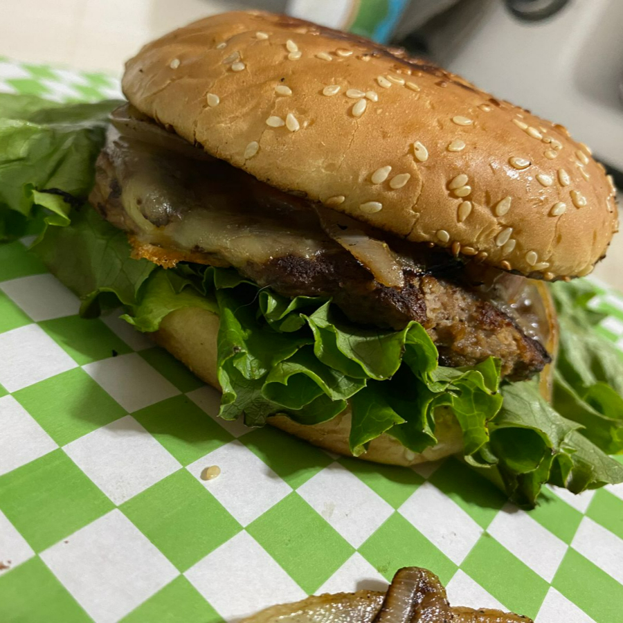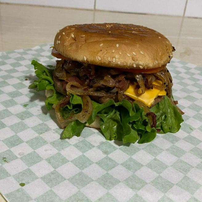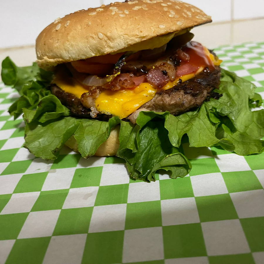 Pan clásico, queso amarillo, complemento, tocino doble, complementos y aderezo de tu preferencia.