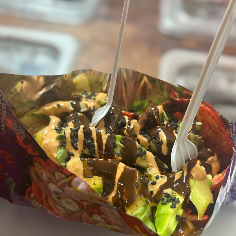 Eliges tú base de tostitos, tu polvo de Sabritas, tu topping y agrega la sopa instantánea más esquite delicioso