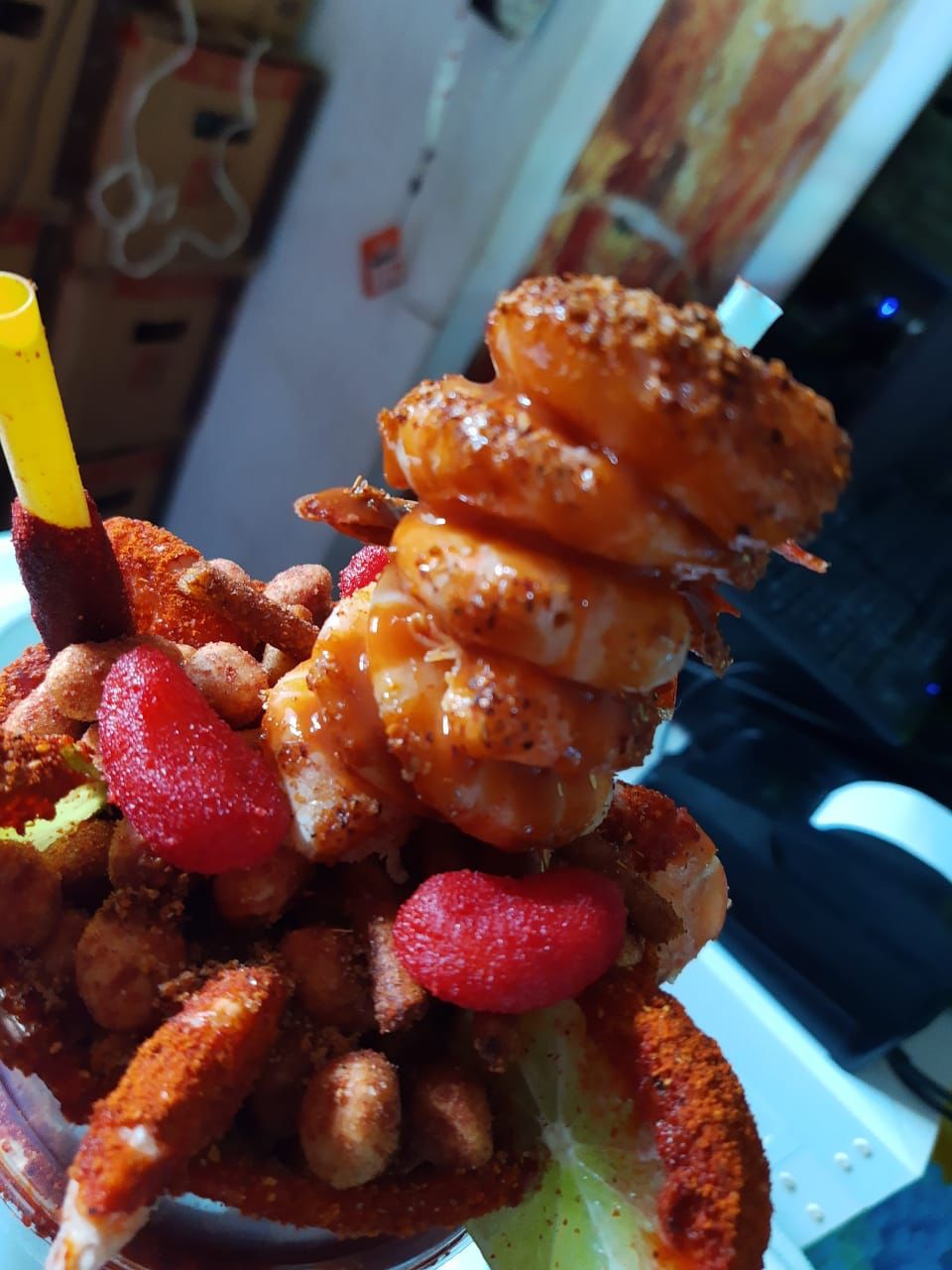 Par de brochetas de camarón.