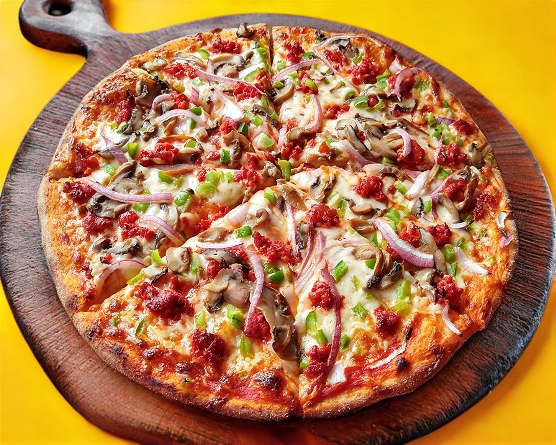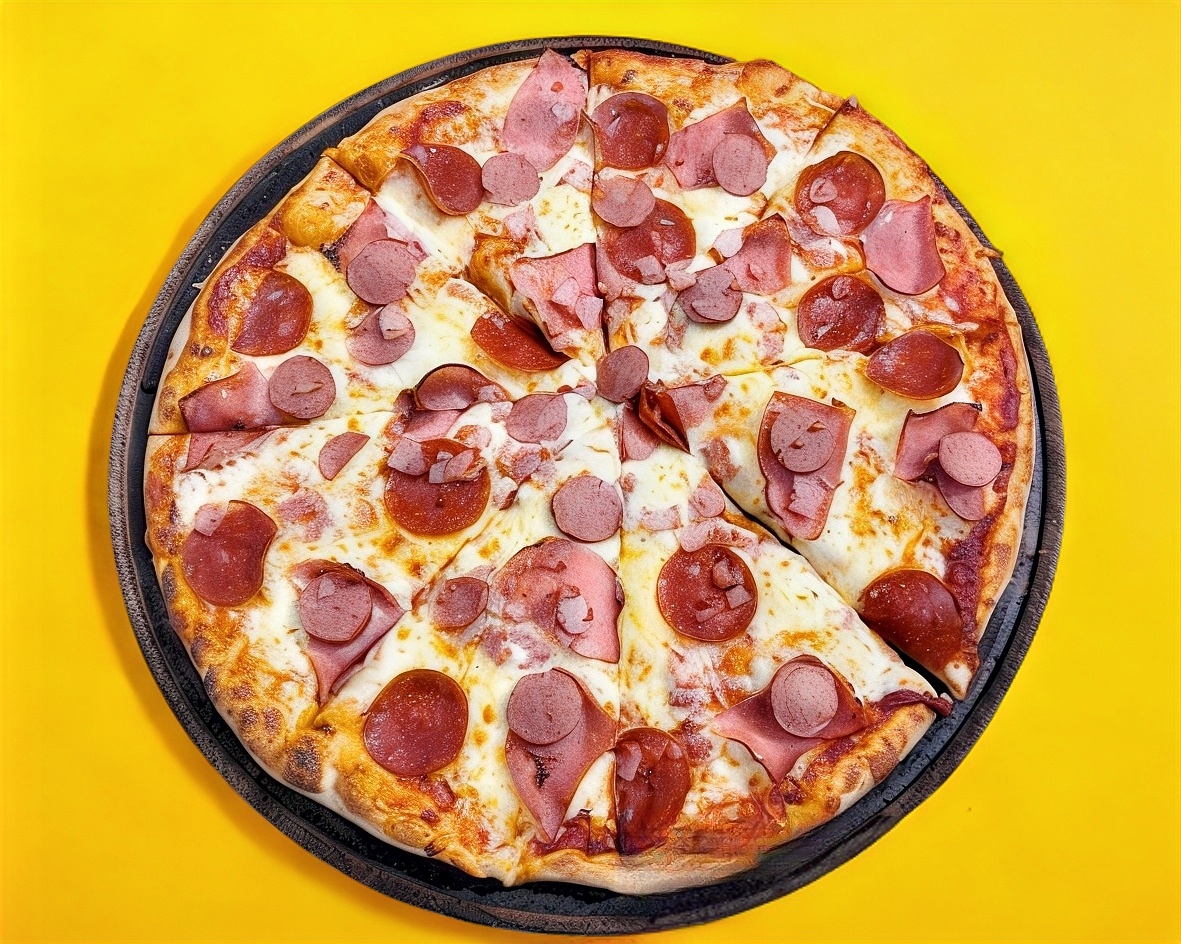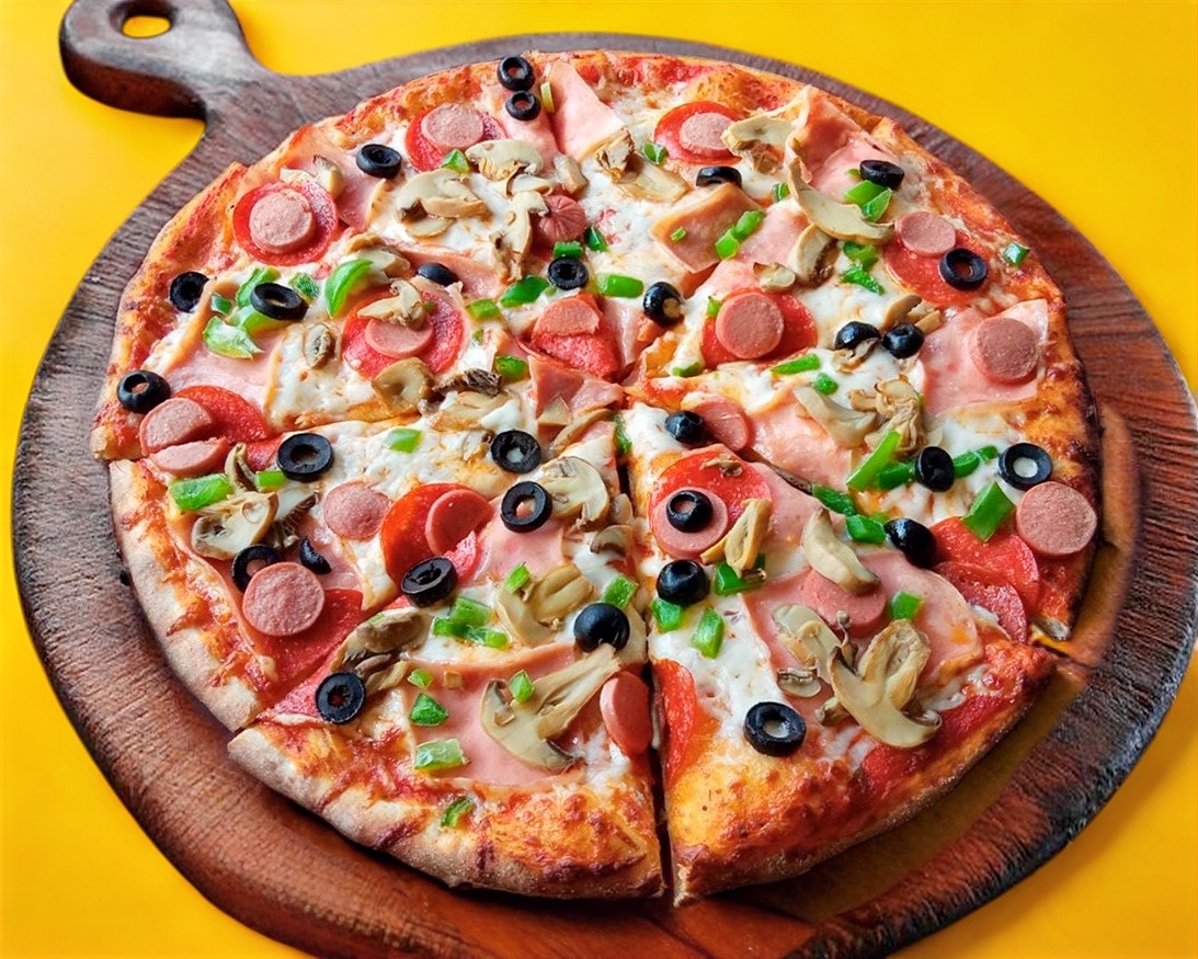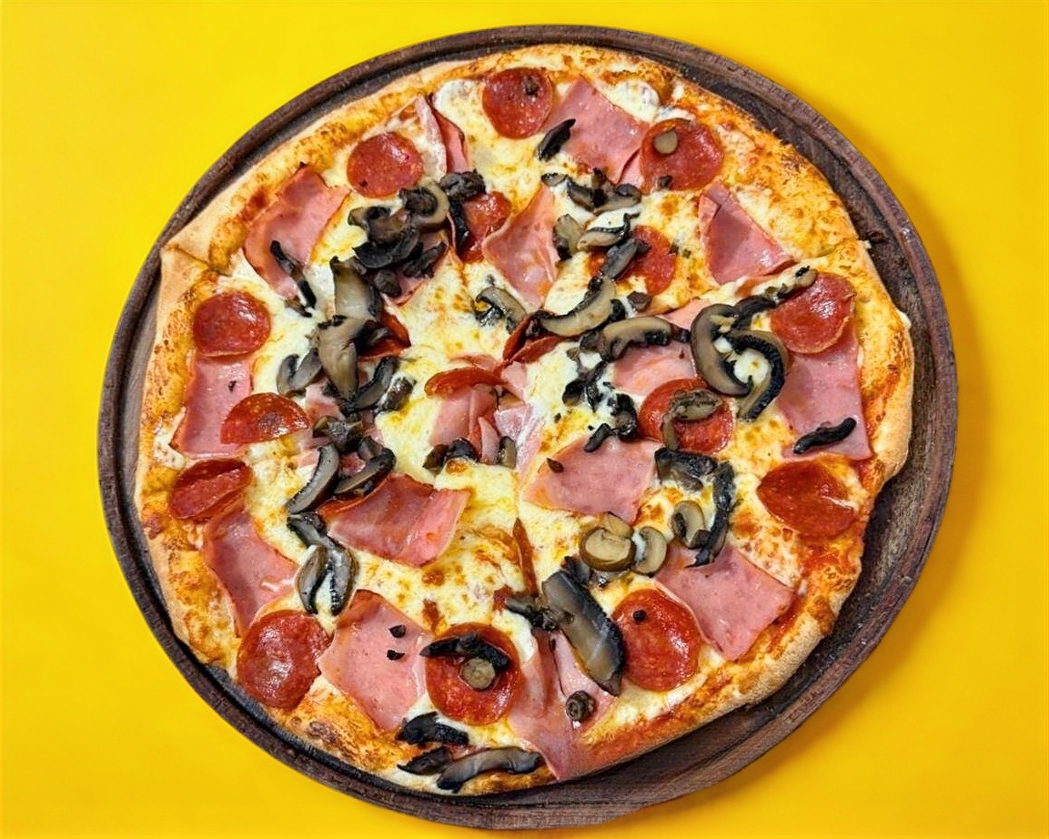 Pepperoni, jamón, salchicha, champiñones, chile morrón y aceitunas.