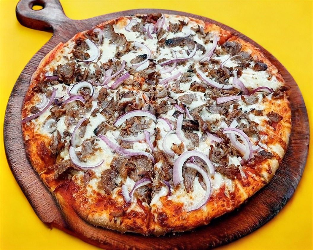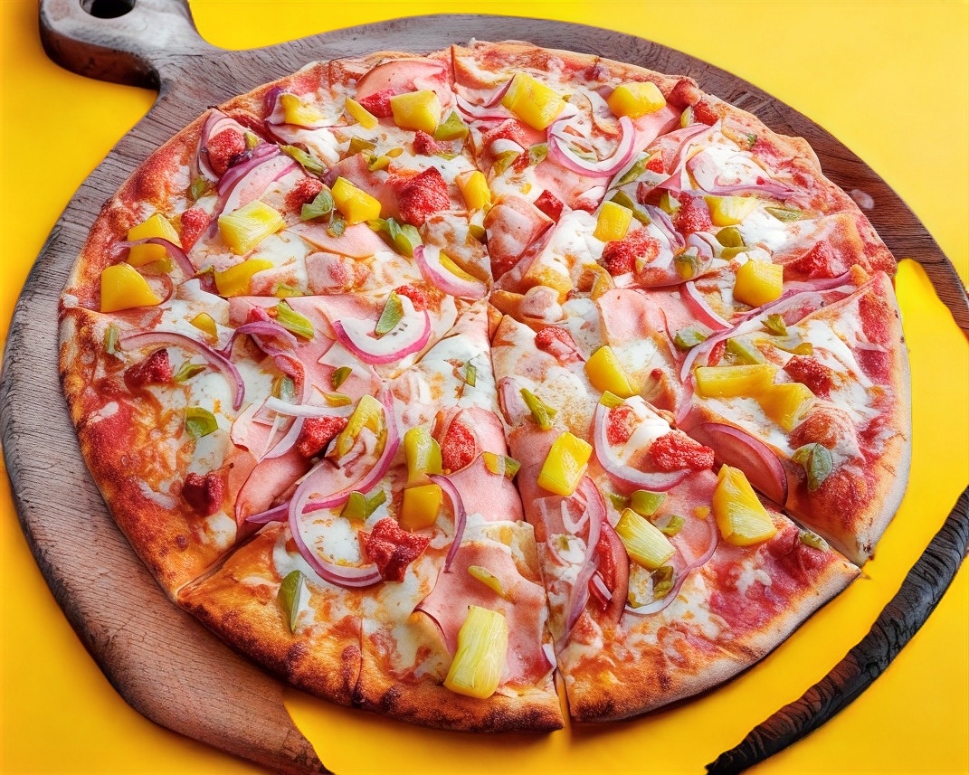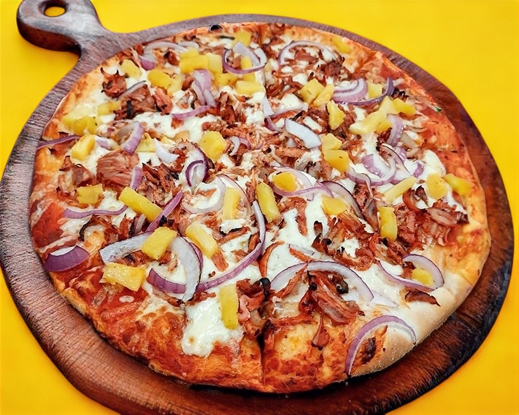 Jamón, piña, chorizo, cebolla morada, rajas y tocino.
