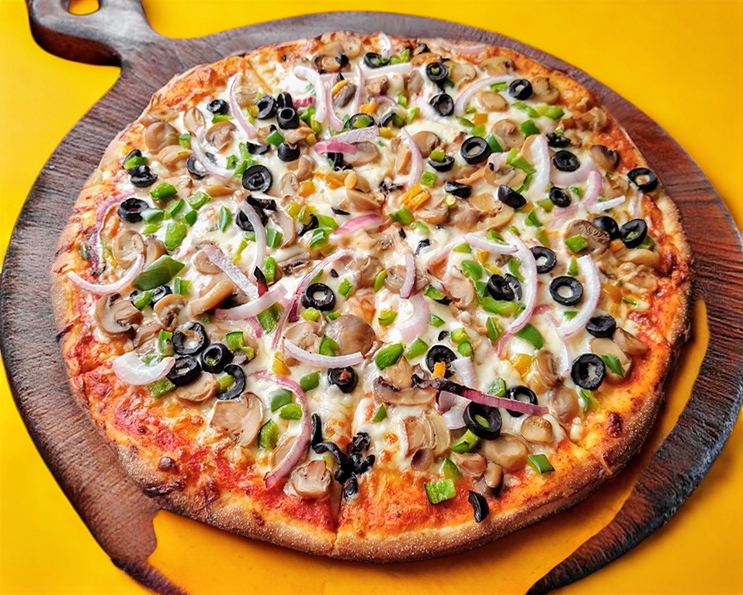 Champiñones, aceituna negra, chile morrón y cebolla morada.