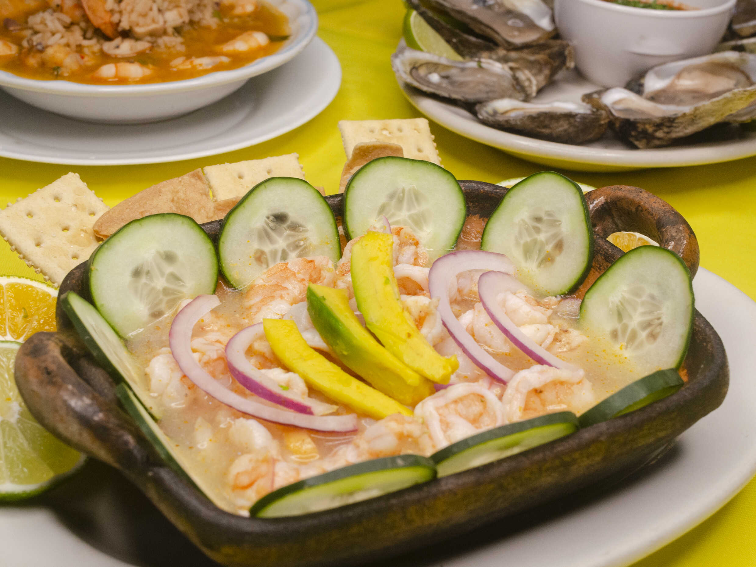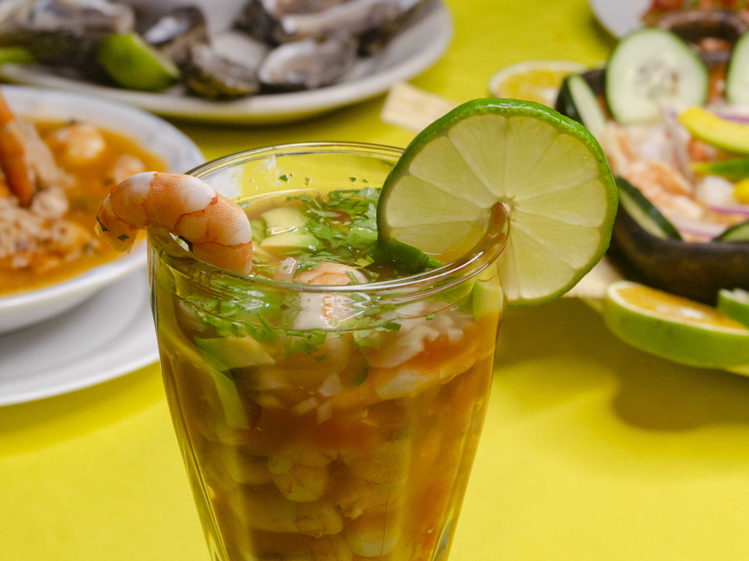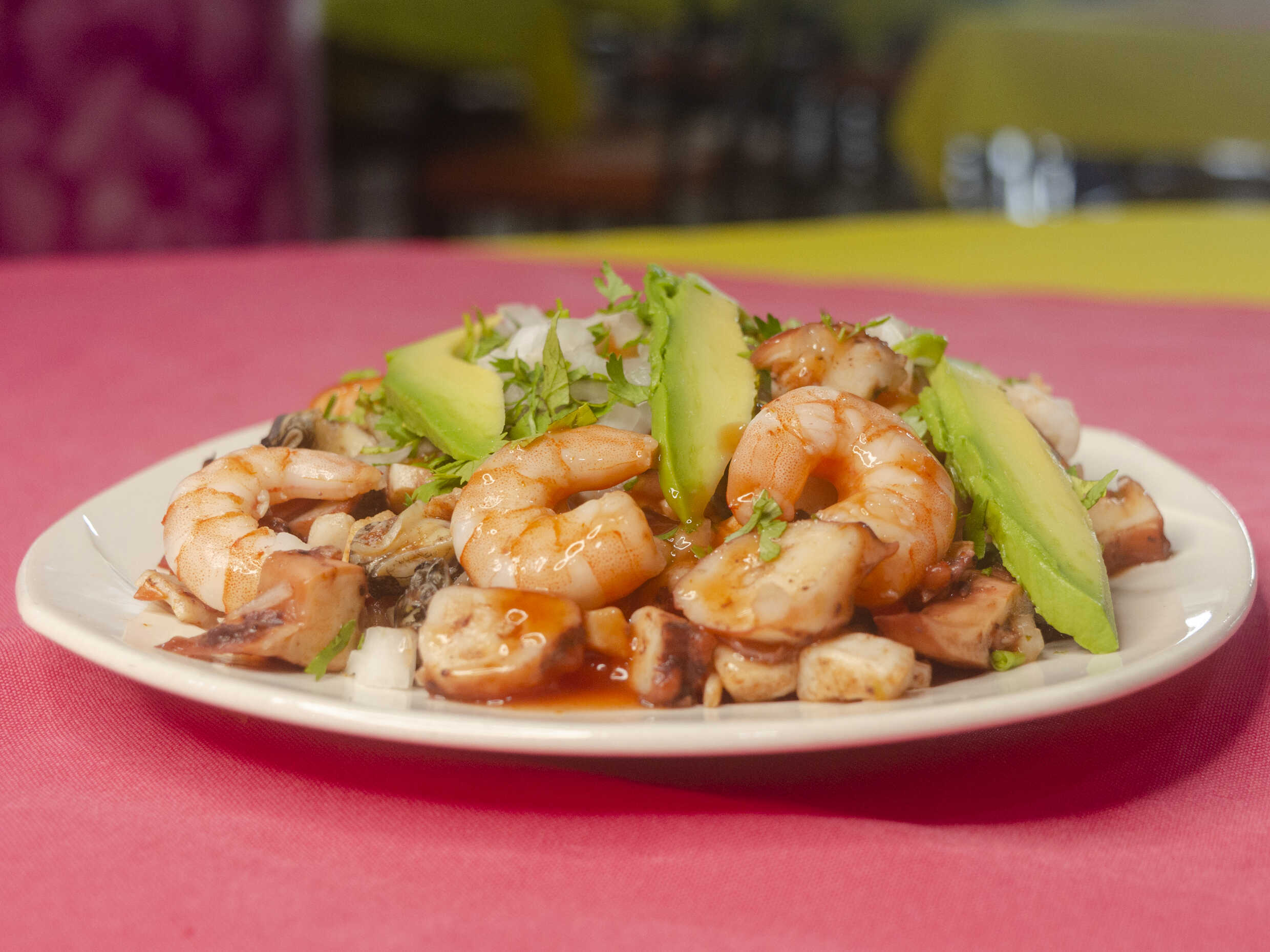 Ensalada de camarón, pulpo o mixta mixeada con sazonadores, cebolla, chiles y pepino.