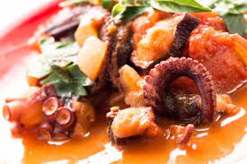 Pulpos guisados con cebolla, tomate, aceitunas y alcaparras.