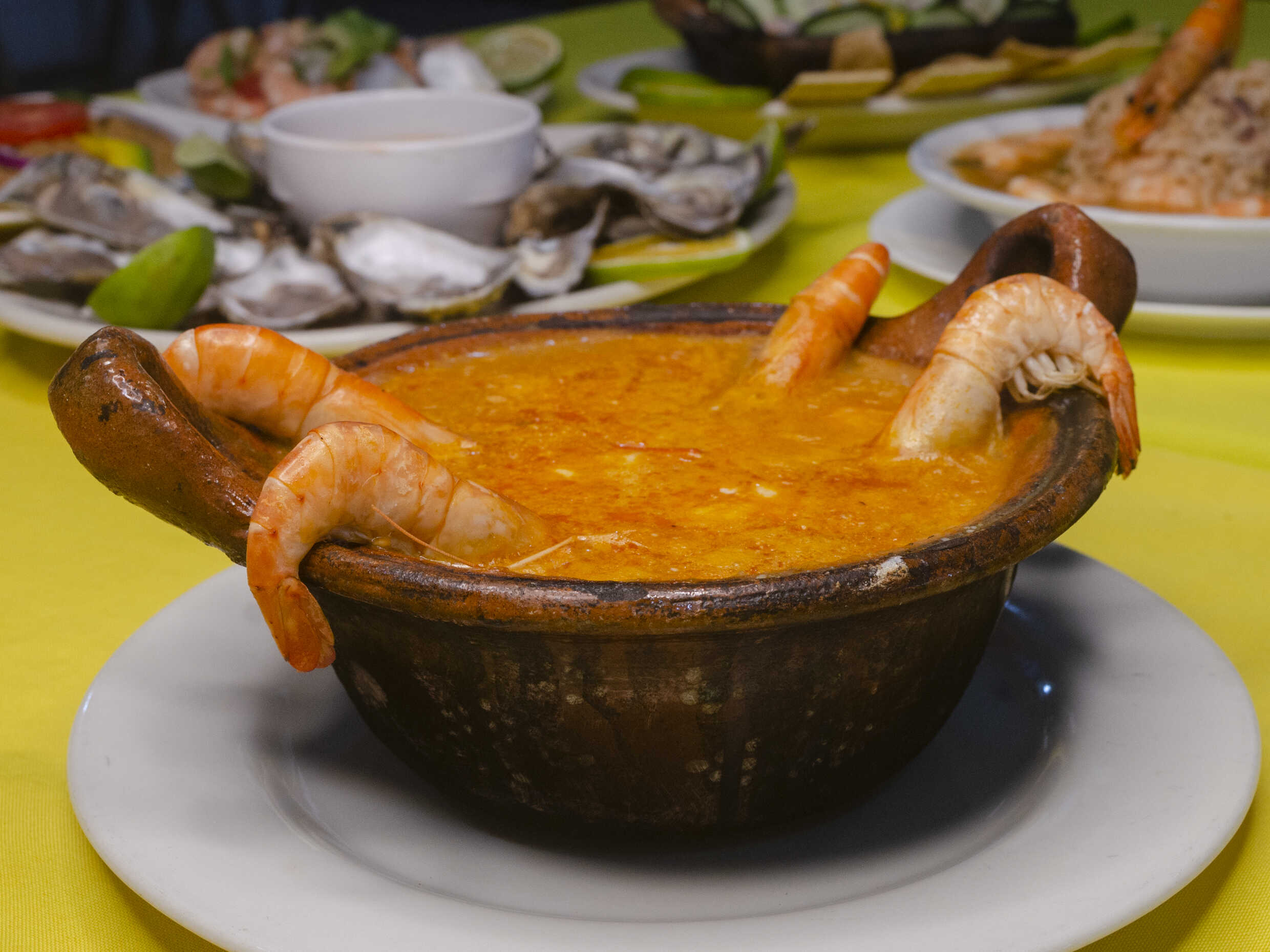 A base de caldo de camarón, con chipotle, crema, queso manchego y mariscos.