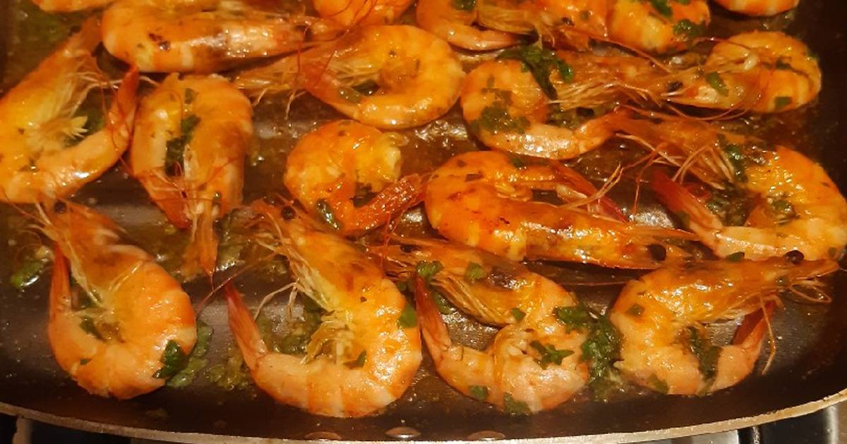 Camarones de mar con cáscara a la plancha.