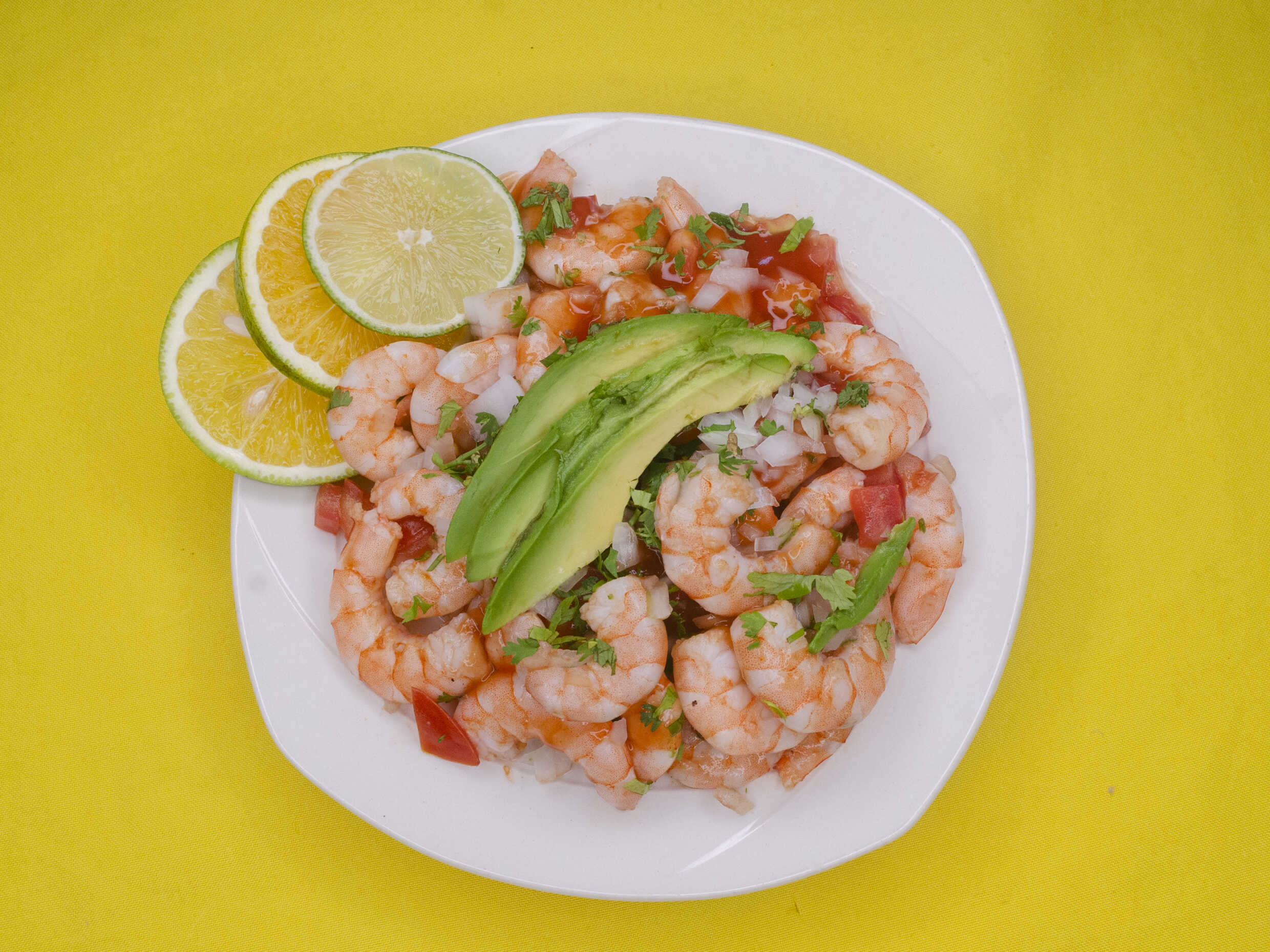 Ensalada de camarón mixeada con aceite de olivo, sazonadores y limón.