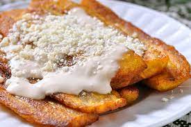 Plátanos fritos con crema y queso rallado.