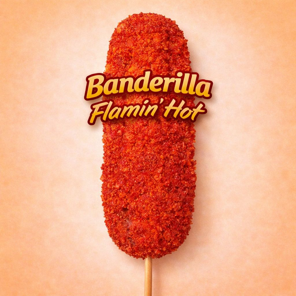 Banderilla de Salchicha, Empanizada con panko, escarchada en Cheetos Flamin Hot