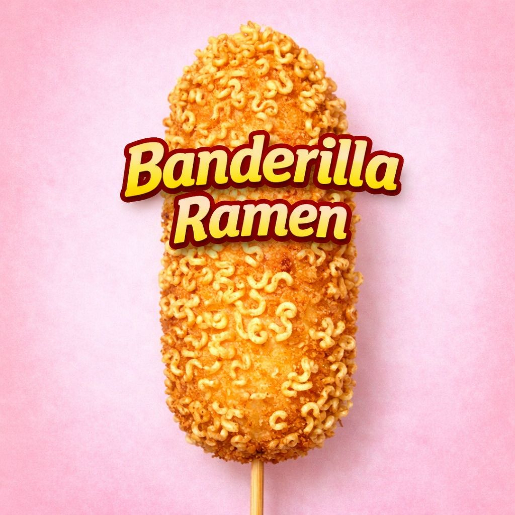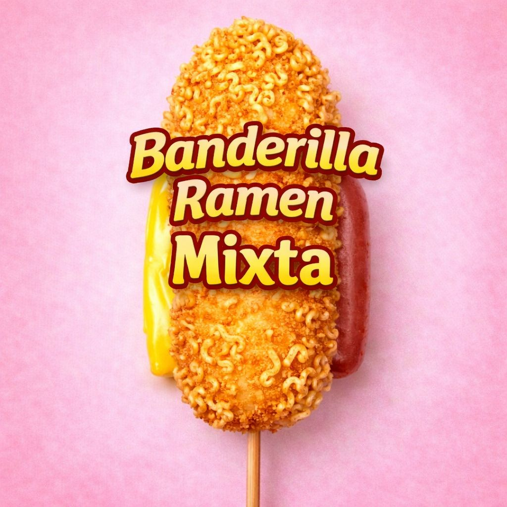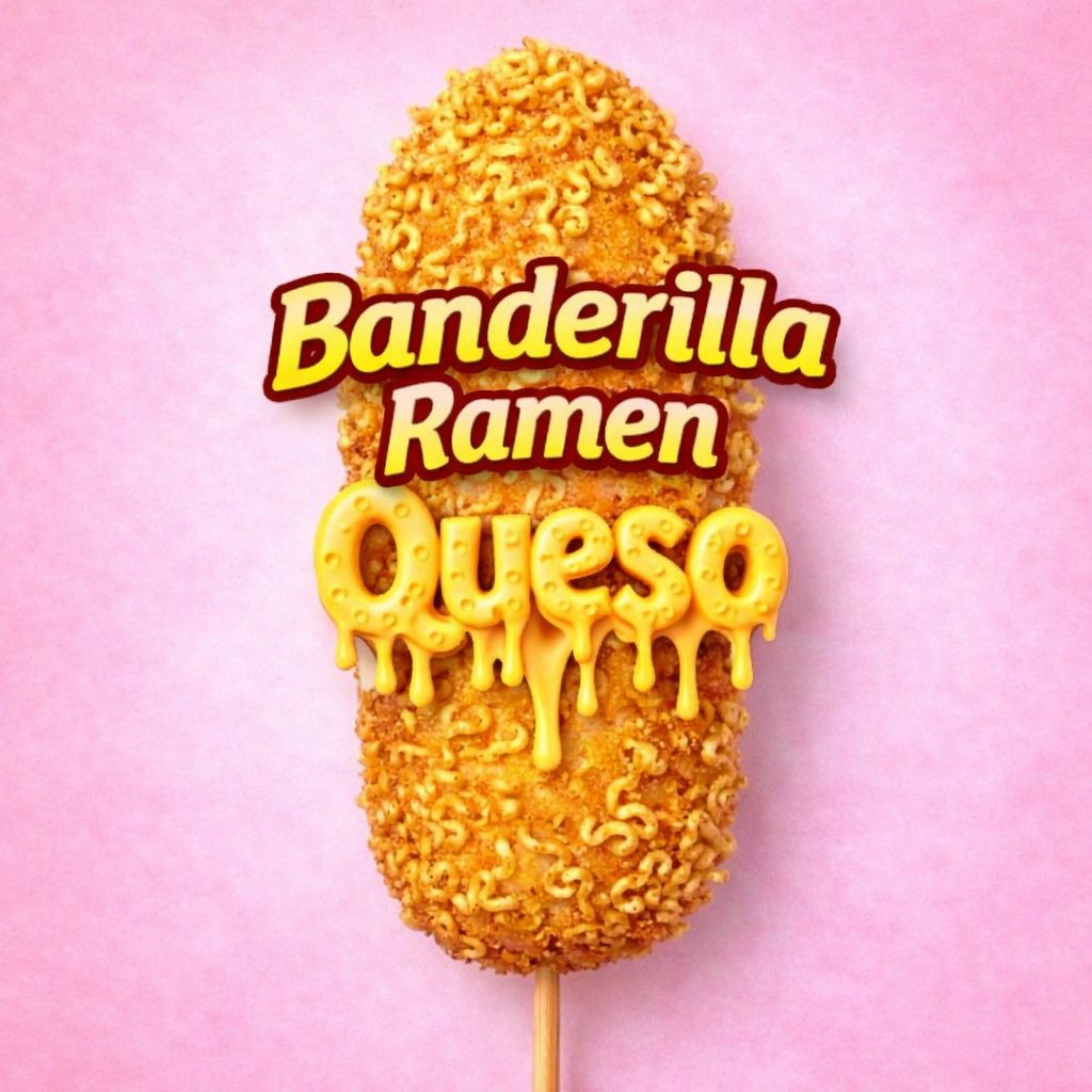 Banderilla rellena de Salchicha y Queso, Empanizado con panko, y cubierto con Ramen