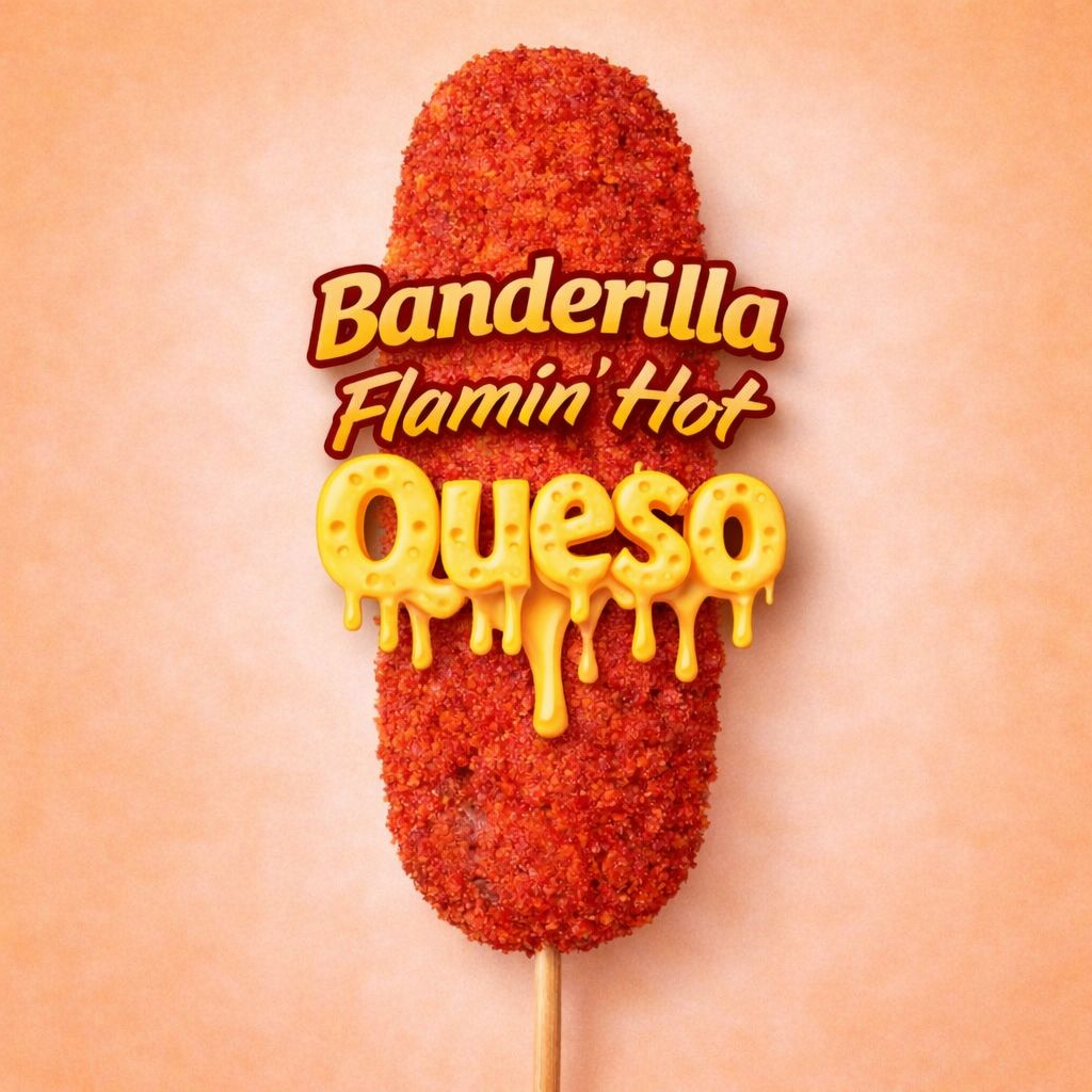 Banderilla rellena de queso, empanizada en Panko, Cubierta con Cheetos Flamin Hot
