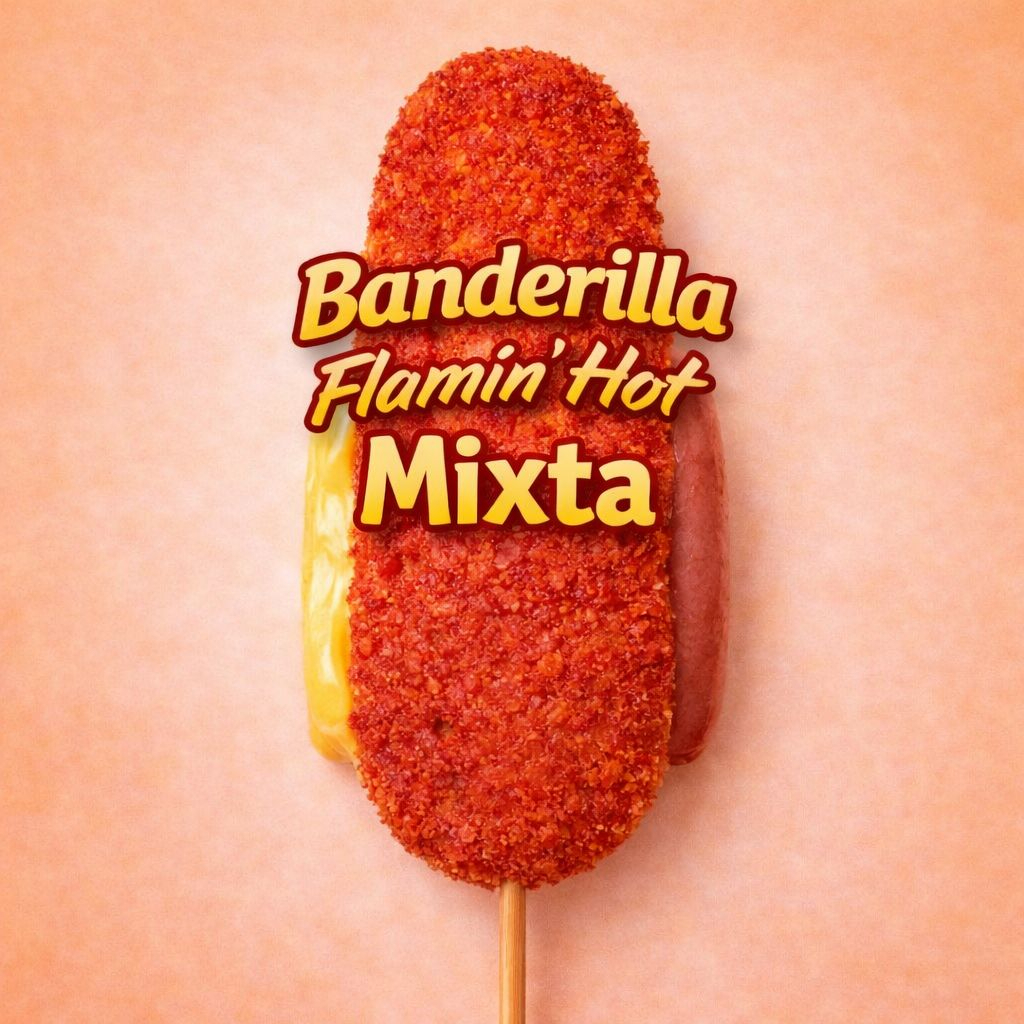 Banderilla rellena de Salchicha y queso, Empanizado con panko, Cubierta con Cheetos Flamin Hot