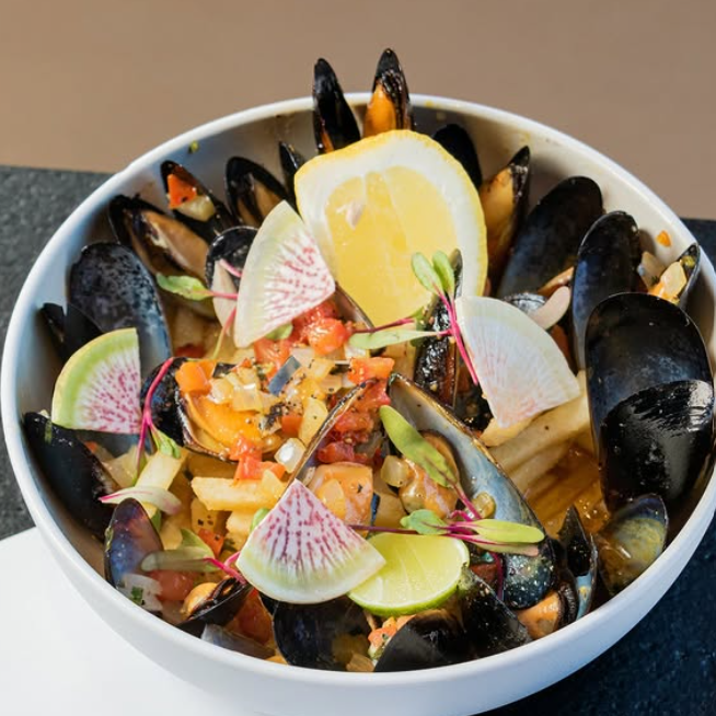 Mejillones al vino blanco, mantequilla, cilantro, tomate, cebolla y paspas a la francesa