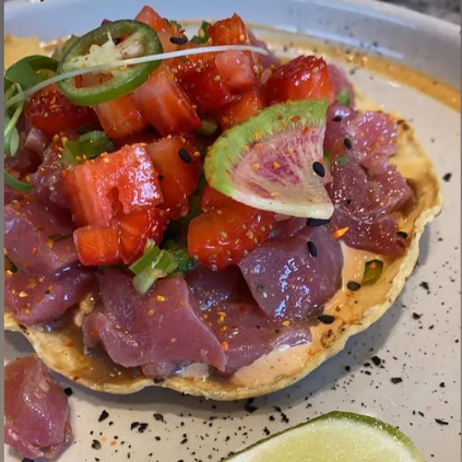 Orden de 2 Tostadas Citrica De Atun marinado en salsa de soya citrica, base de mayonesa-chipotle, fresa y serrano