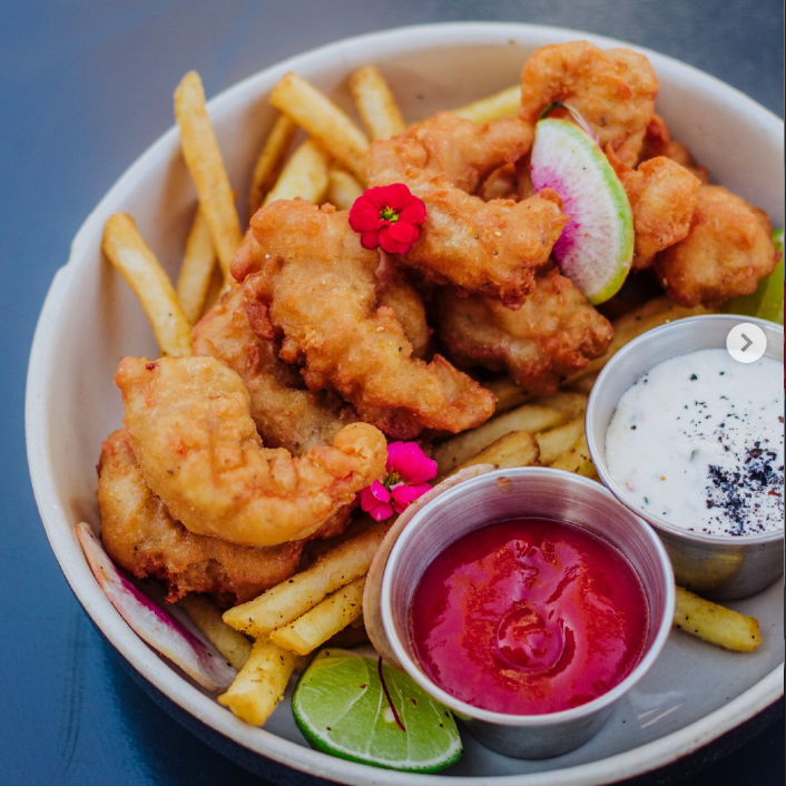 Camaron capeado (120 gr) acompañado de papas a la francesa, catsup y salsa tartara