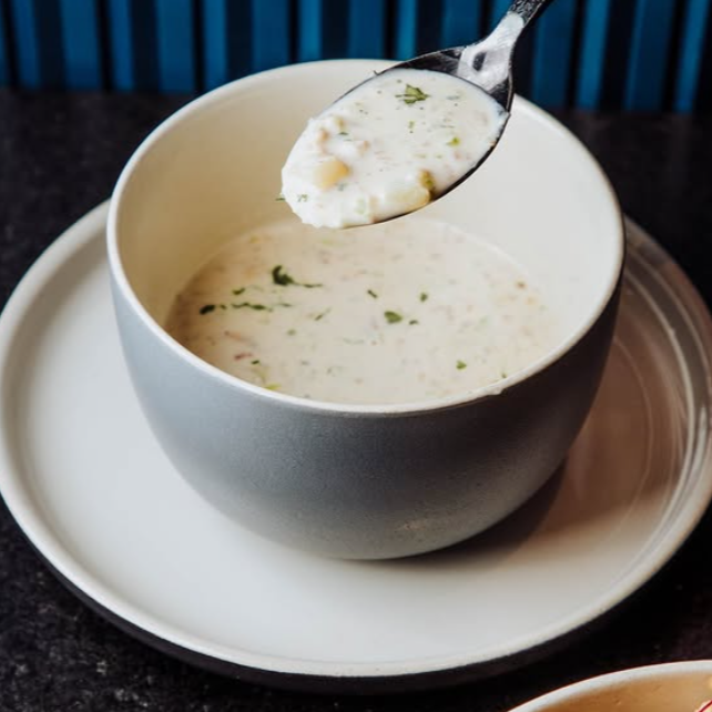 Clam Chowder, crema de almeja, tocino, papa, apio y cebolla