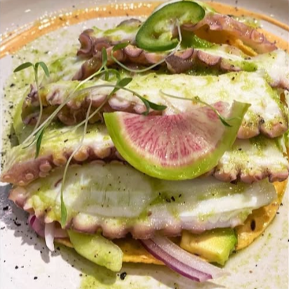 Pulpo cocido (100 gr), aguacate, pepino y cebolla morada, salsa a elegir (verde, roja o 7 chiles) abarca para 2 tostadas