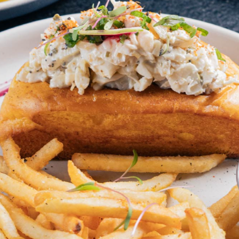 Lobster Roll, pan brioche con ensalada de langosta acompañado de papas a la francesa