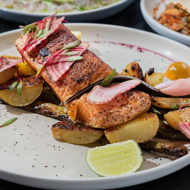 Salmon (200 gr) al carbón a las finas hierbas acompañado de espárragos y papitas cambray