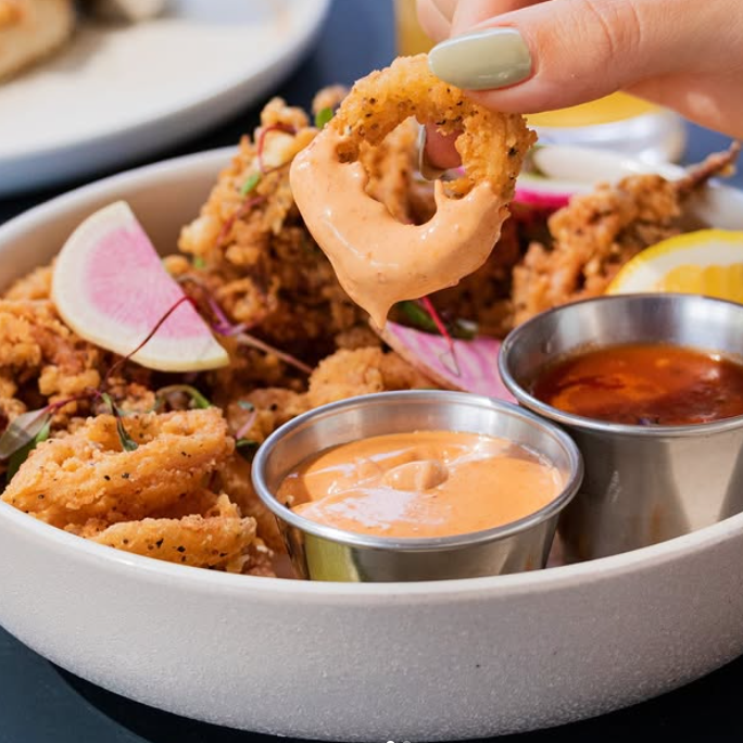 Aros De Calamar fritos acompañados de salsa chipotle y marinada