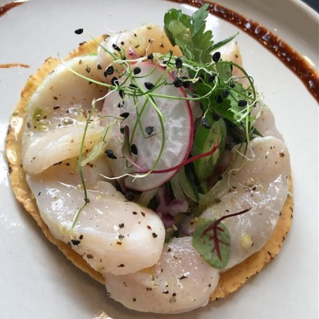 Pesca del dia , salsa ponzu, aceite de ajonjoli, serrano, togarashi y cebollin