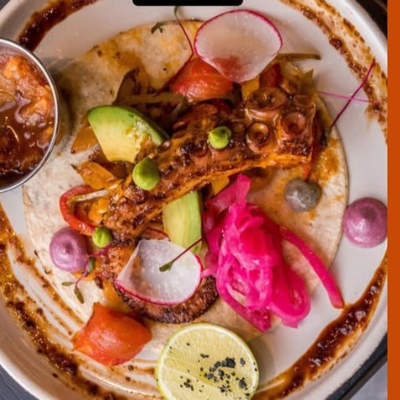 Orden 2 Tacos Pulpo Brazas, tortilla de maiz, pulpo zarandeado, mix de morrones , aguacate y cebolla curtida