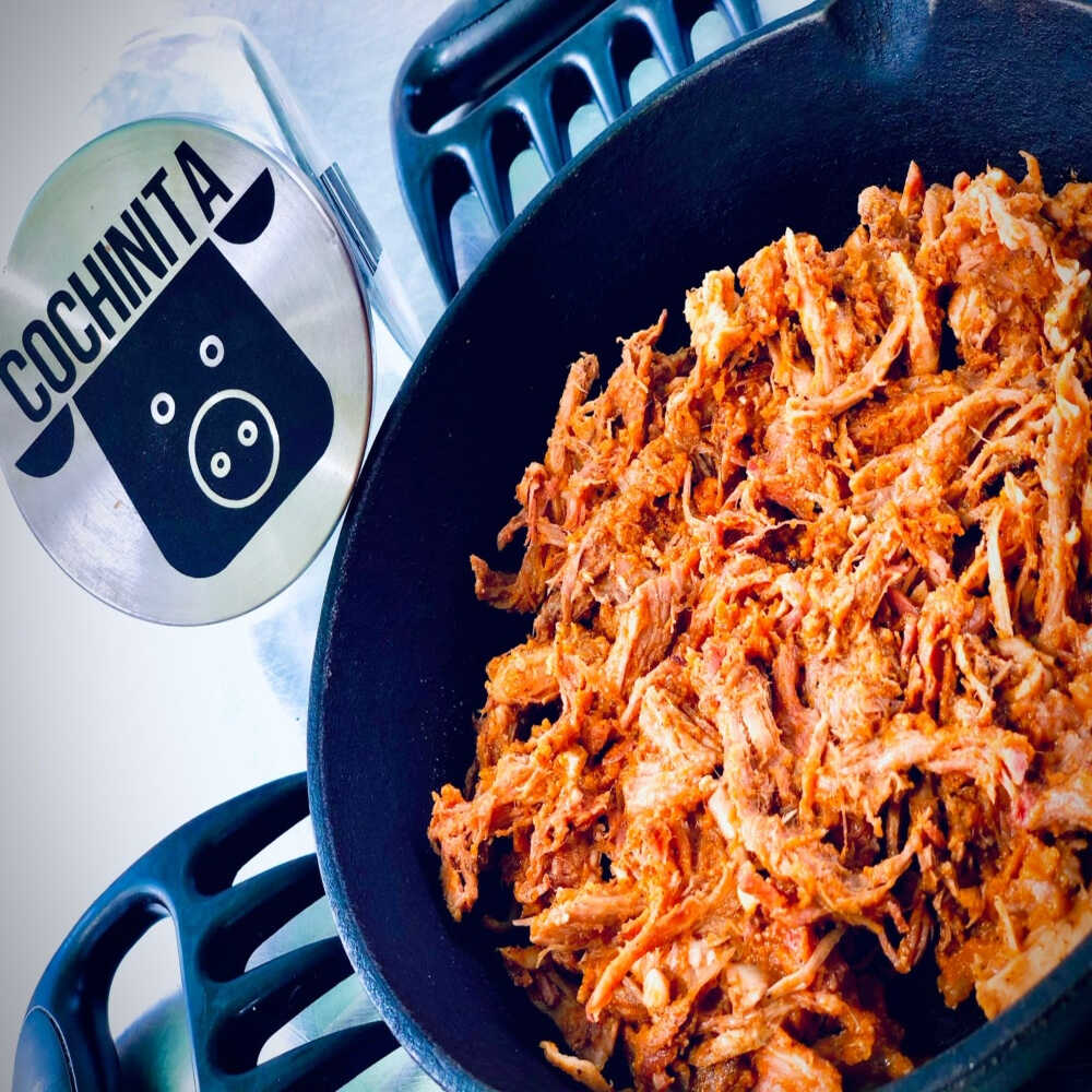 1/2 Kilo de cochinita ahumada en mezquita, preparada en adobo de pibil, acompañada de cilantro, cebolla, encurtido de cebolla morada, habanero y tortillas.