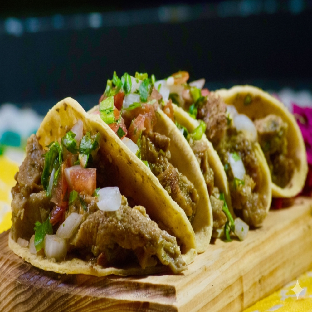 1/2 Kilo de chicarrón en corte fino, bañado en una salsa morita adictiva, lo acompañan cilantro, cebolla, encurtido de cebolla morada, habanero y tortillas.
