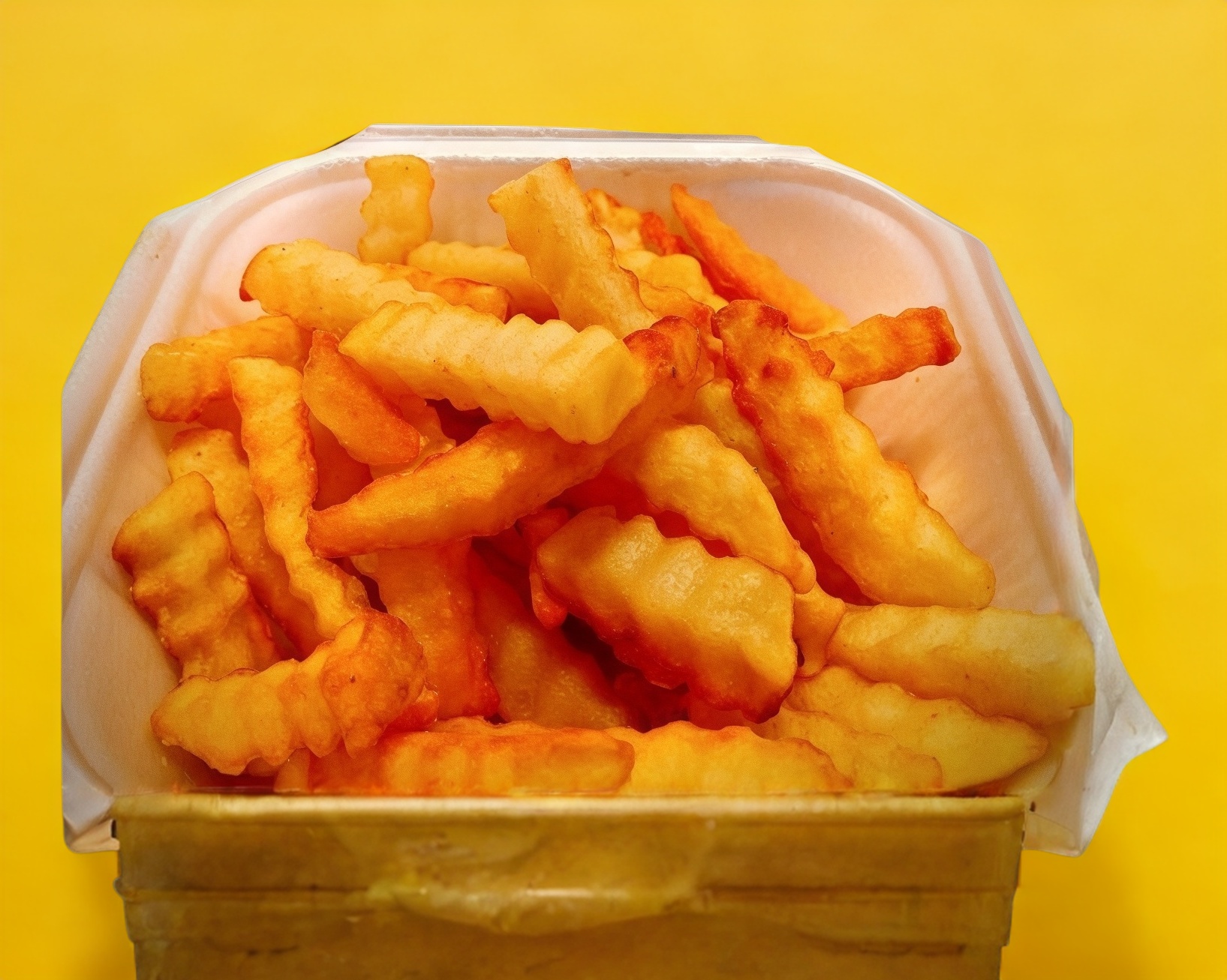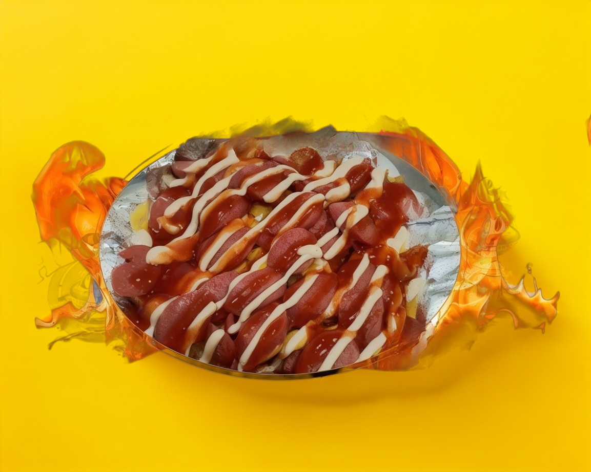 Trocitos de salchicha con papas a la francesa. Con queso cheddar , mayonesa y catsup
