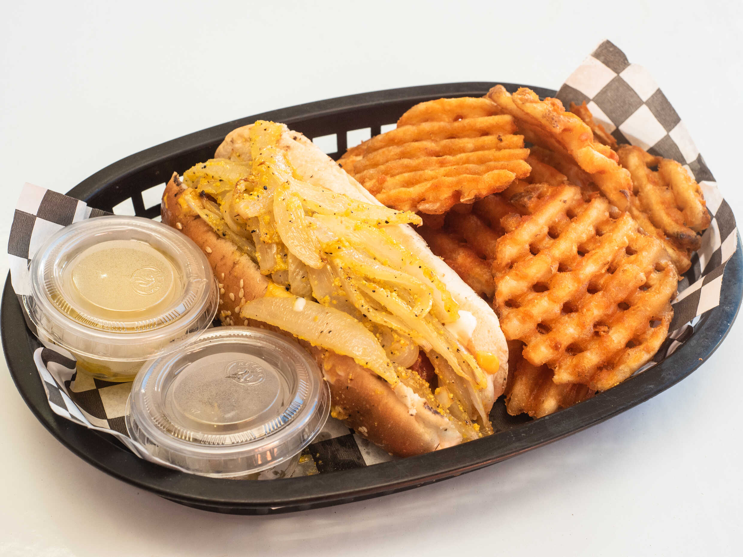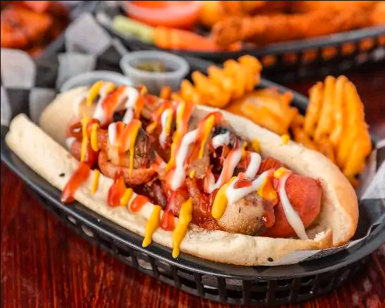 Salchicha polaca jumbo, tocino, aros de cebolla, salsa BBQ. Acompañado de papas a la francesa, chiles en vinagre y pepinillos.