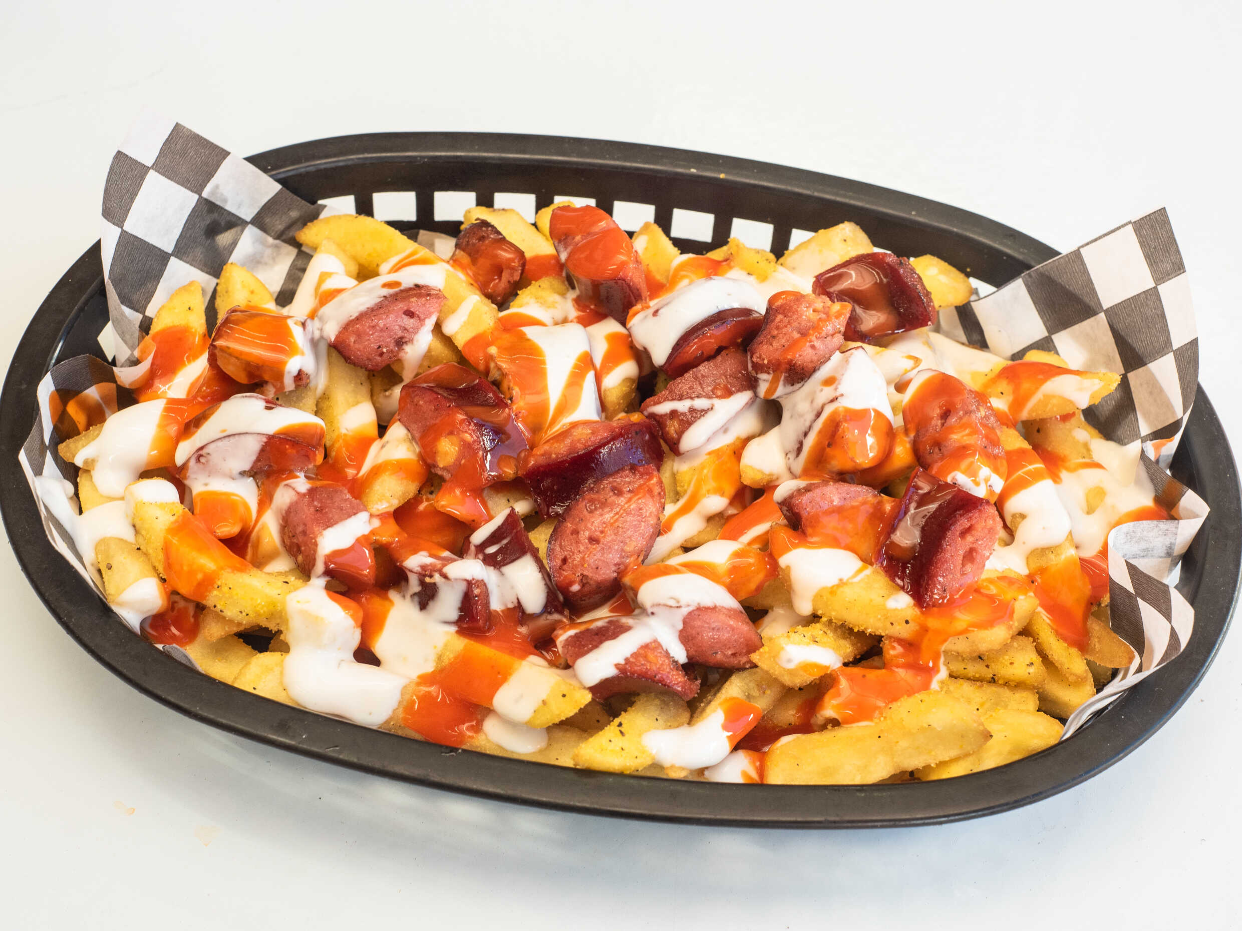 Papas a la francesa con trozos de salchichas schubling, bañadas de salsa búfalo y aderezo blue cheese.