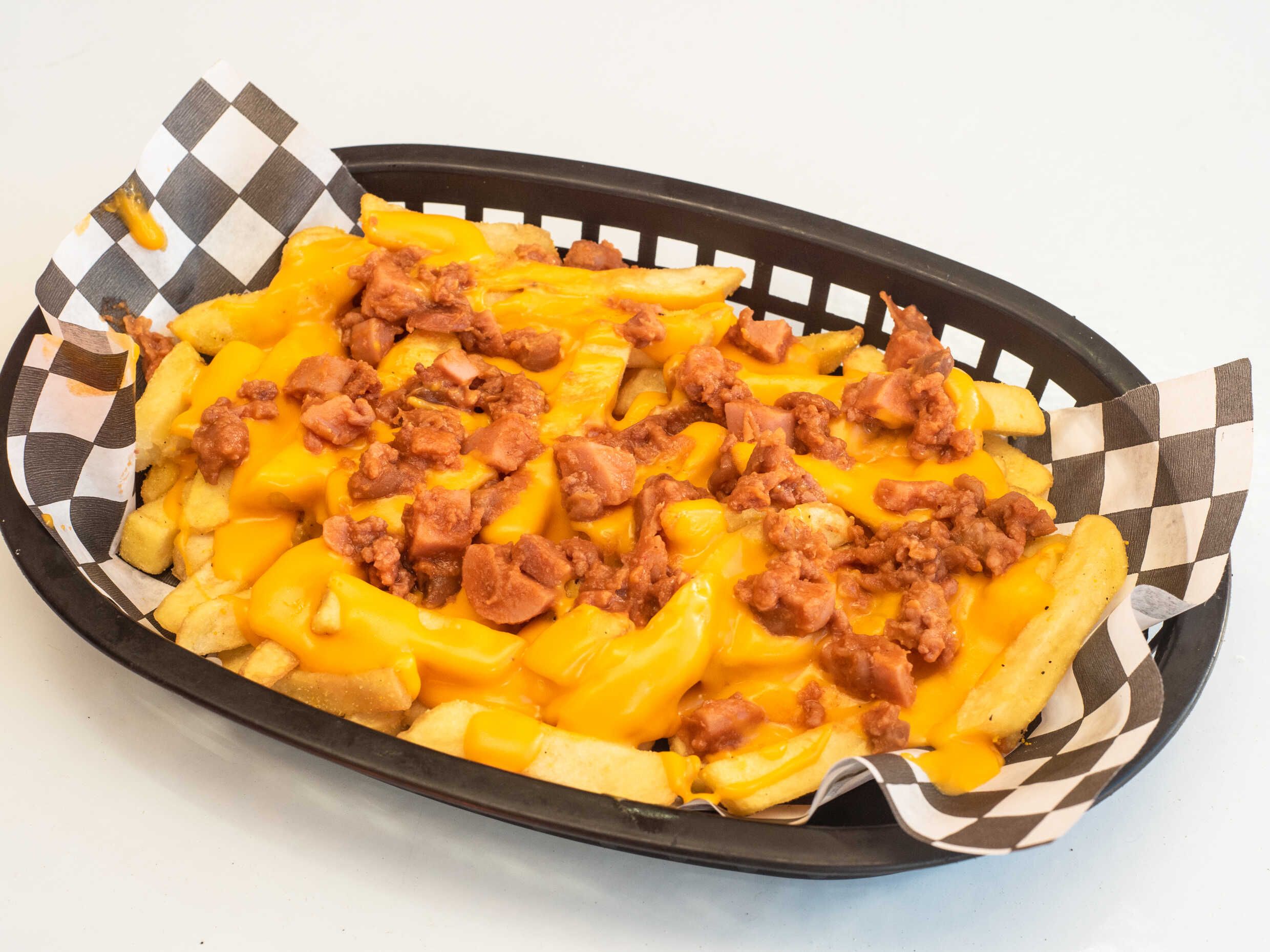 Papas a la francesa, bañadas de chili beans y queso cheddar liquido, acompañadas de chiles en vinagre.