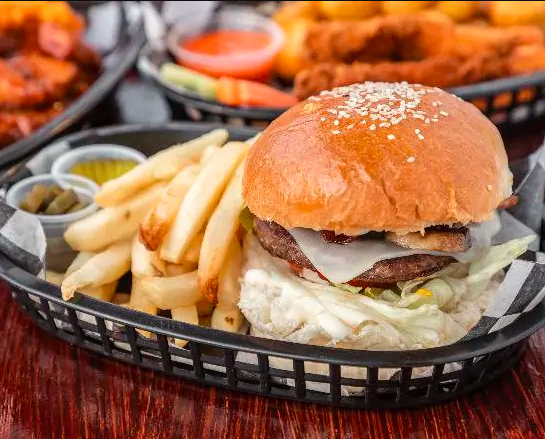 Carne de res en pan artesanal, aros de cebolla, queso blanco, tocino, salsa BBQ. Acompañadas de papas a la francesa, chiles en vinagre y pepinillos.