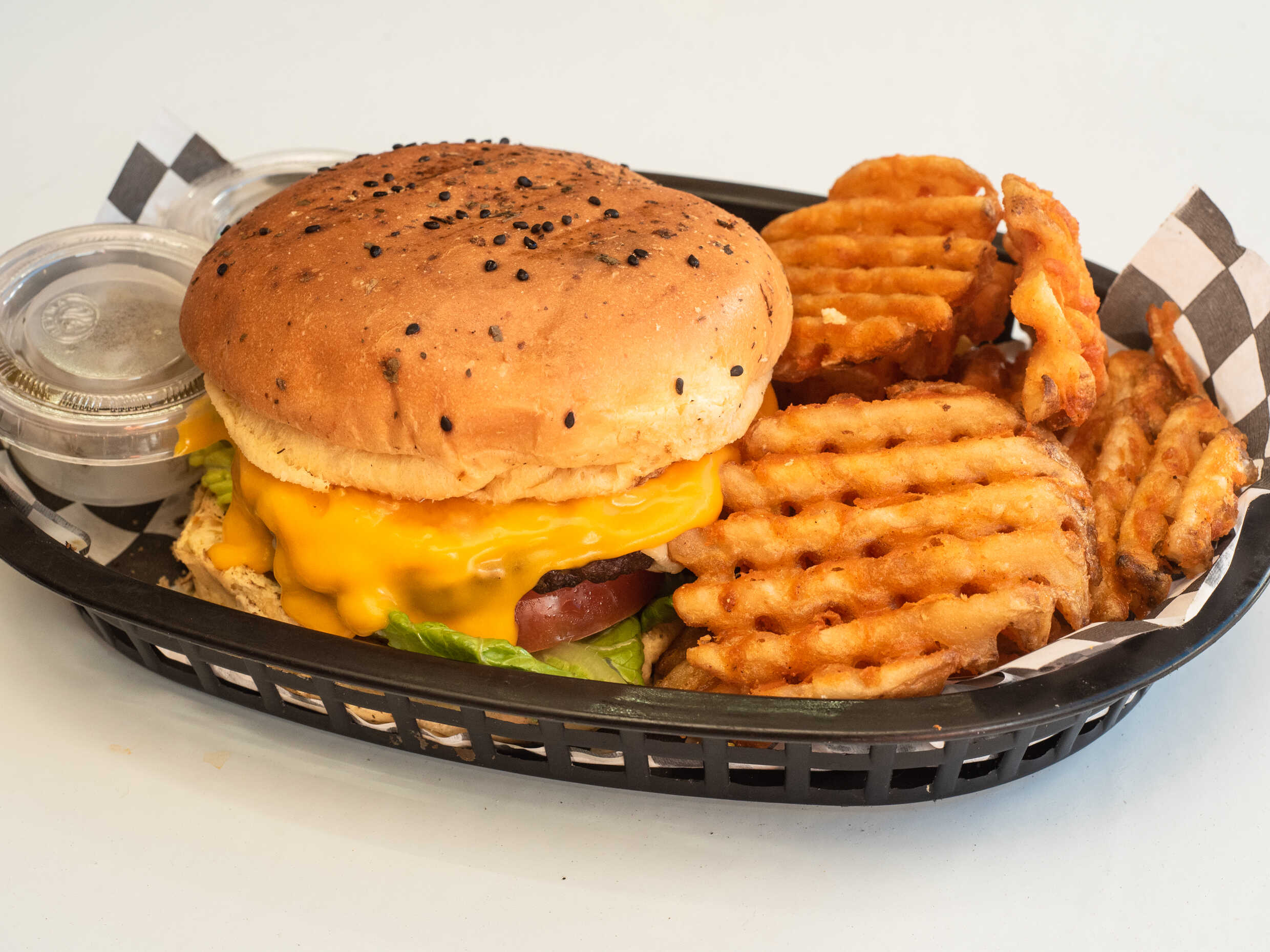 Doble carne de res, queso cheedar, cebolla salteada, queso blanco, lechuga y tomate, acompañada de papas a la francesa.