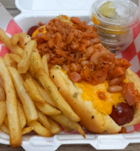 Salchicha polaca jumbo, chili beans, queso chedar liquido. Acompañado de papas a la francesa, chiles en vinagre y pepinillos.