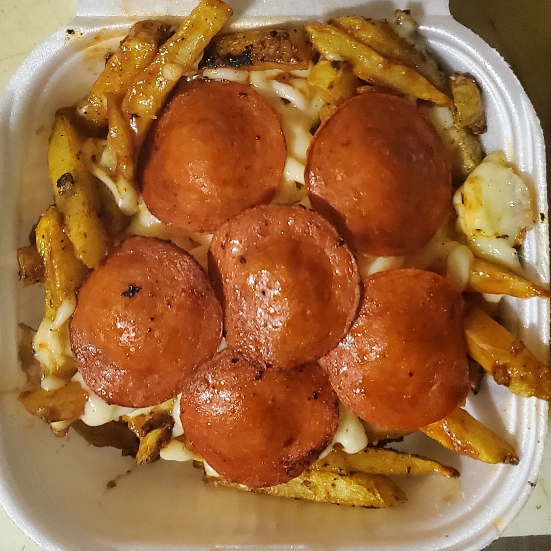 250 gr. de papas fritas, bañadas en salsa de tomate, queso manchego y pepperoni.