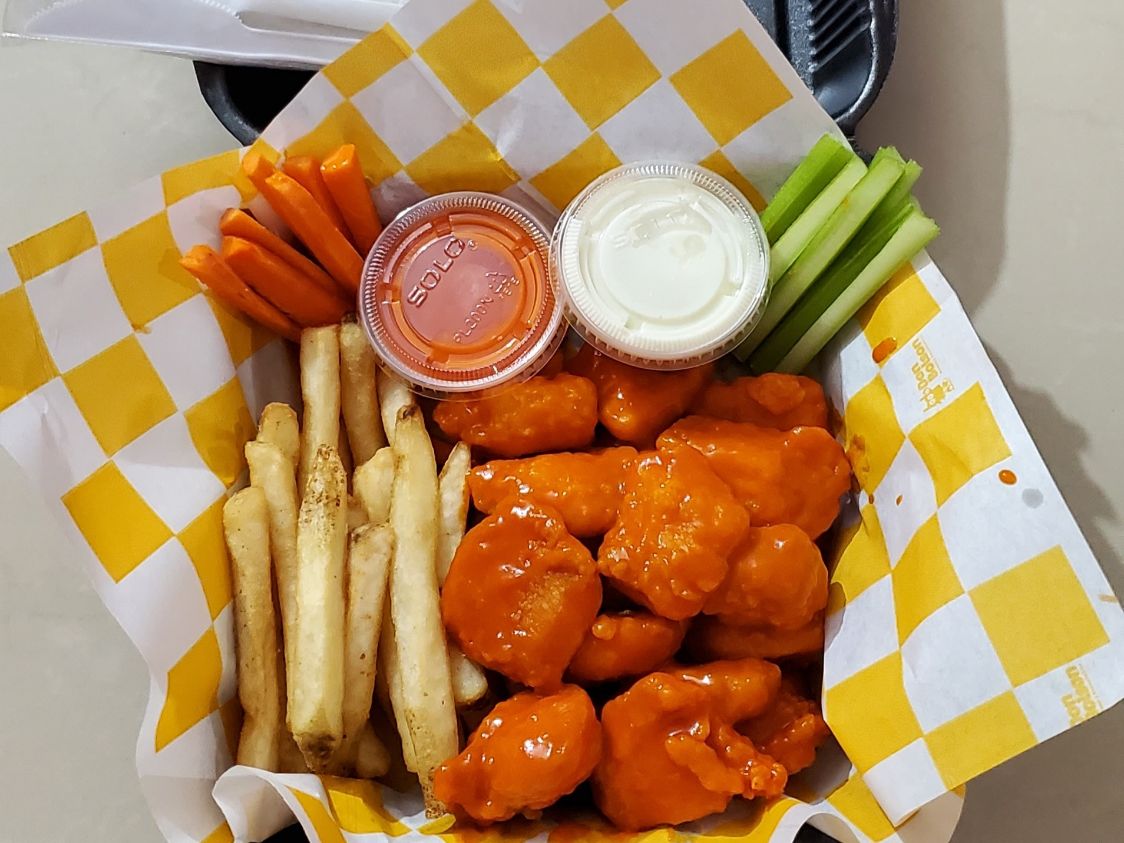 250 gr. de boneless en buffalo, refresco y papas fritas.