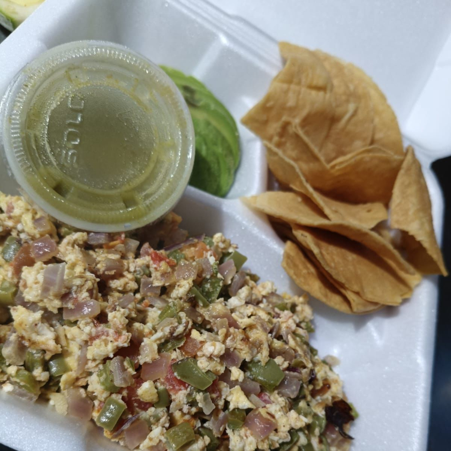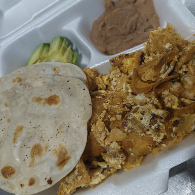 Tortilla frita de maiz, huevo revuelto, acompañada de salsa de la casa y queso oaxaca