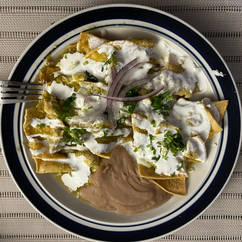 Totopos, frijoles, 1 salsa, queso oaxaca, crema, cilantro y cebolla morada